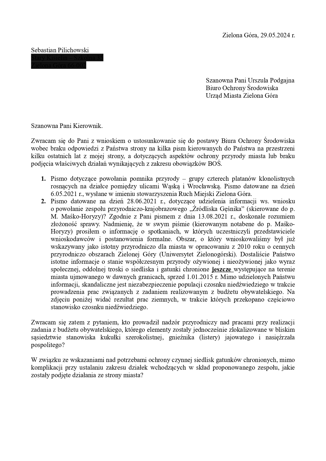 1) pismo z dnia 29.05.2024 r. skierowane do kierownik Biura Ochrony Środowiska, Urząd Miasta Zielona Góra ws. licznych tematów z przeszłości, wobec których zdecydowanie termin odpowiedzi minął niekiedy lata wstecz oraz odpowiedź z UM (tu wspomnę, że pani uzrędnik z BOŚ prowadząca sprawę wykazała się dużą charyzmą i zaangażowaniem w załagodzenie sprawy, choć wiele po drodze do realizacji części tematów się wydarzayć jeszcze musiało...,