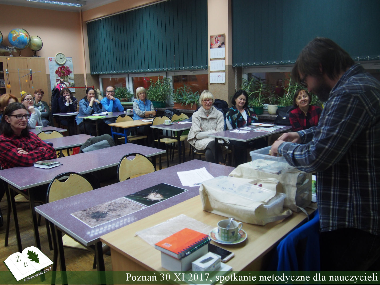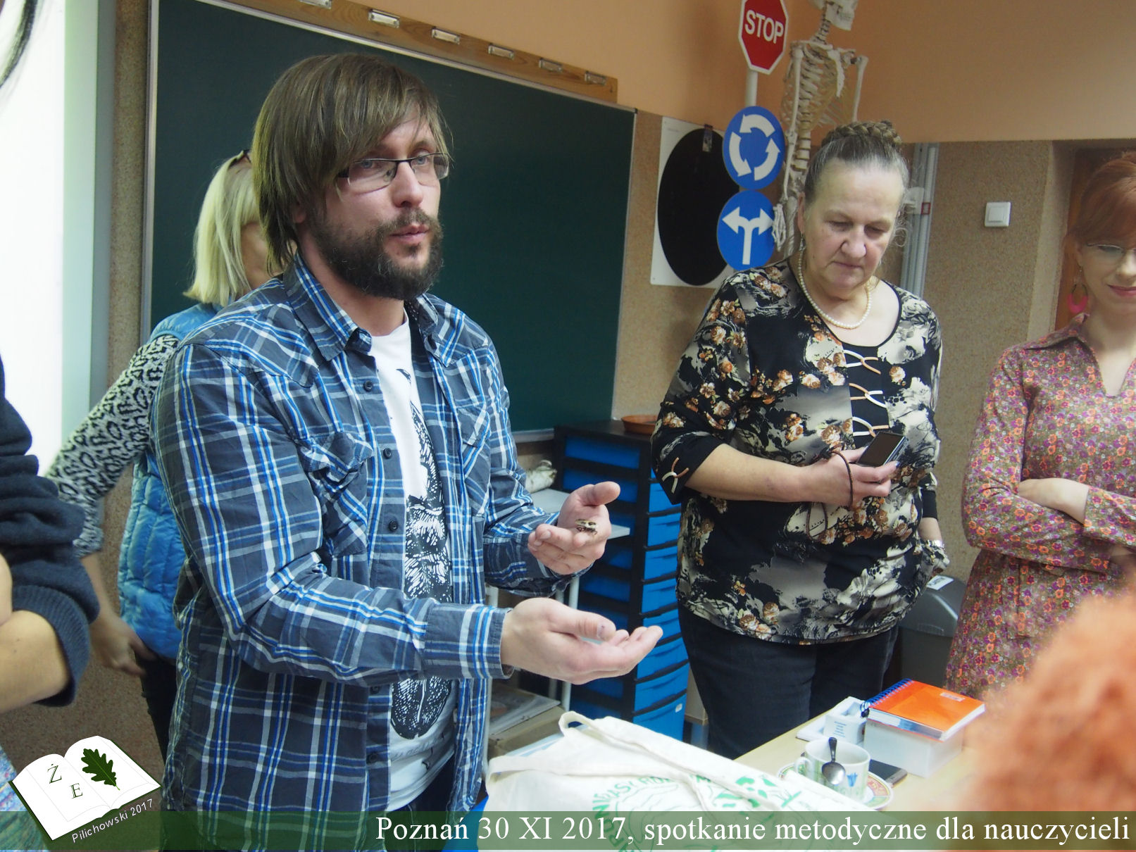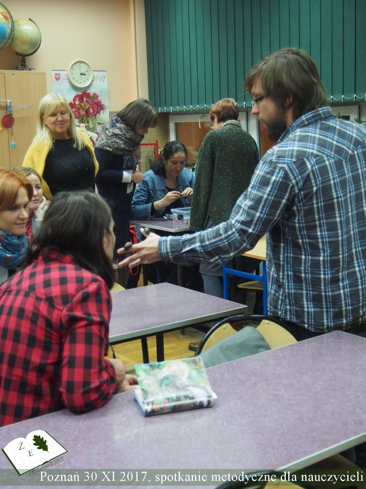30 listopada 2017 roku odbyło się spotkanie metodyczne dla nauczycieli przyrody i biologii oraz metodyków, na które zostałem zaproszony. Z wielką przyjemnością opowiedziałem i pokazałem, jak prowadzę zajęcia, na co zwracam uwagę, gdzie dostrzegam pewne problemy. Bazując na swoich doświadczeniach zarówno opartych na prowadzonej działalności, ale i pracy w ogrodzie botanicznym jako edukator, w szkole podstawowej jako nauczyciel przyrody oraz w dużej mierze bazując na wszystkich świetnych wydarzeniach związanych z rozwiązaną już pracownią muzealno-hodowlaną przy Wydziale Nauk Biologicznych UZ, podzieliłem się swoimi spostrzeżeniami. Zasygnalizowałem problem z prowadzeniem obserwacji przez dzieci oraz co w pierwszej kolejności dostrzegają dzieci myśląc o owadach. Uwypukliłem z odwiecznym chyba problemem z odróżnianiem "konika polnego" od pasikonika i świerszcza oraz pszczoły, trzmiela, osy i szerszenia. Na zakończenie nauczyciele z wielką chęcią zapoznali się z żywymi owadami, bez większych oporów biorąc na ręce bezkręgowce.