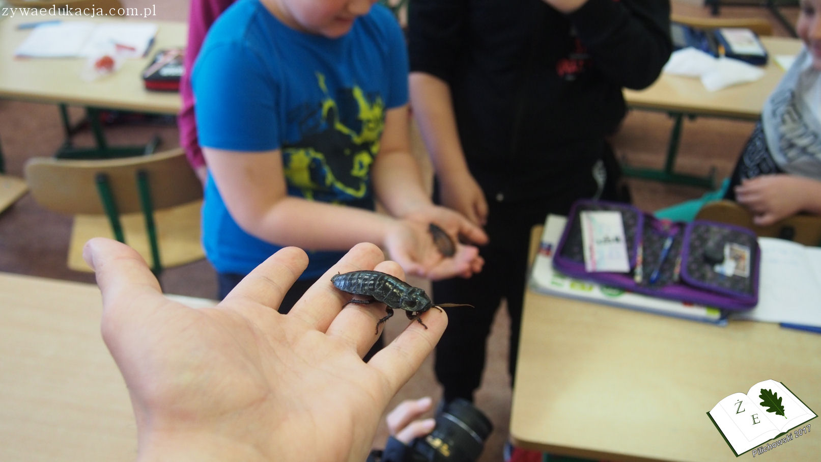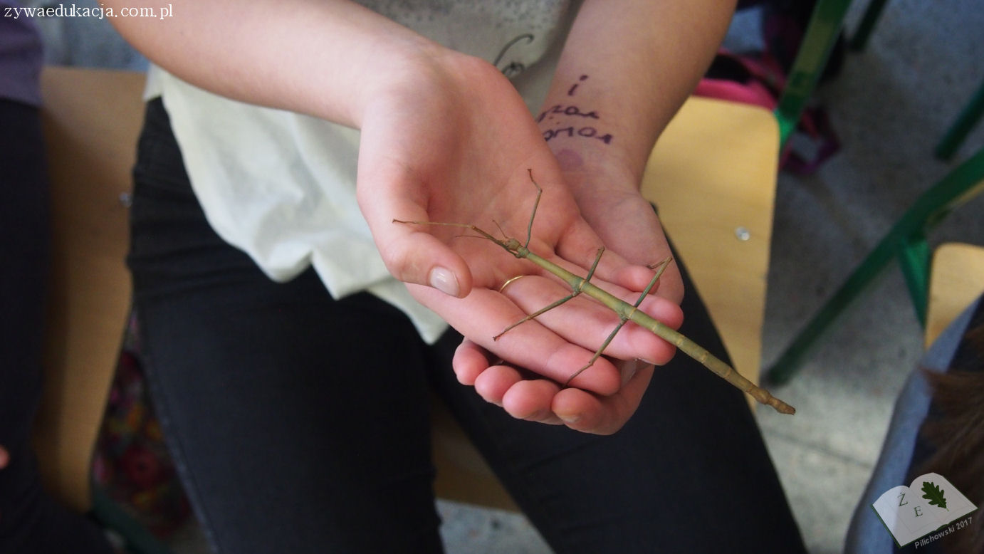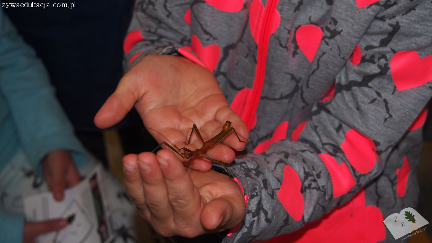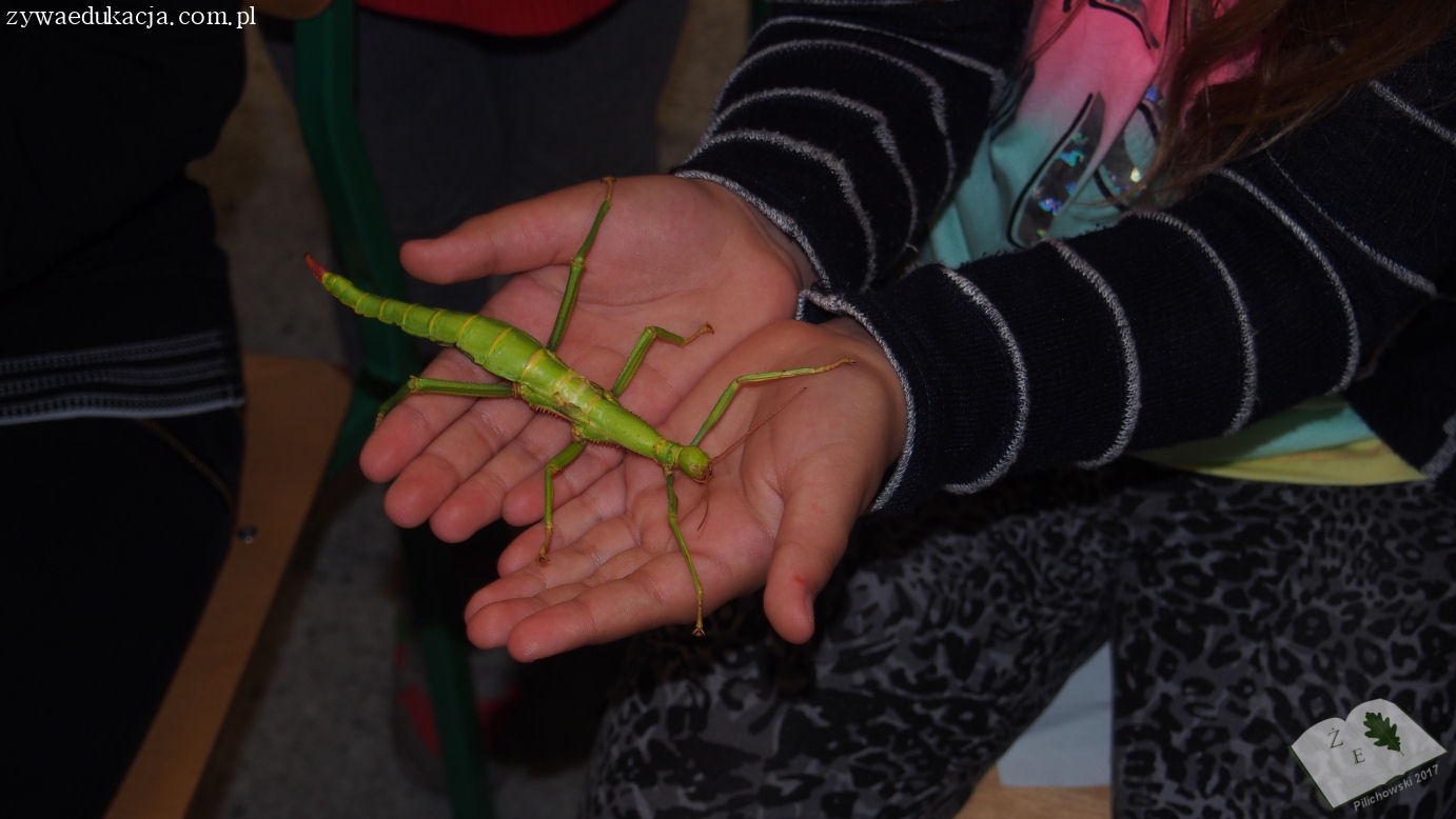 Piątek był dość pracowitym dniem. Niby weekend tuż tuz, ale swoje trzeba jeszcze zrobić. Choć praca wymagająca sił i głosu, to zarazem przyjemna - dwie grupy przedszkolne i trzy szkolne, czyli łącznie pięć grup dzieci i uczniów do pobudzenia wrażliwości na przyrodę. Temat główny? Owady. Ich rola, różnorodność, no i oczywiście część pokazowa, czyli bezpośredni kontakt z żywymi, dość sporymi niekiedy okazami owadów. Wielu skusiło się na wzięcie na ręce niektórych karaczanów i/lub straszyków, a co cieszy chyba najbardziej, że znaleźli się i tacy, którzy przełamali strach i obrzydzenie :)