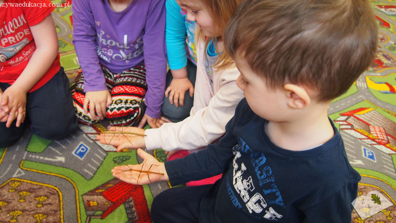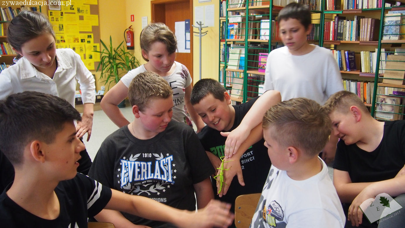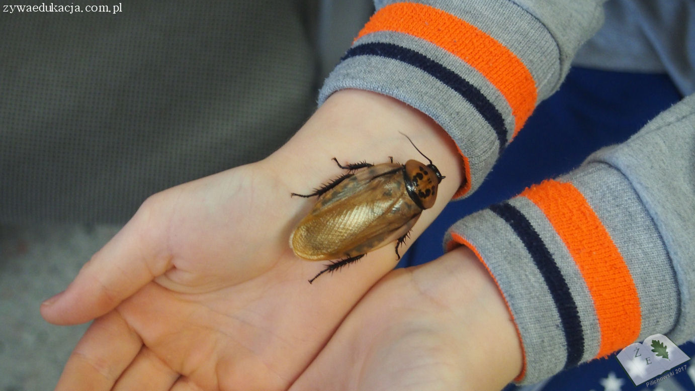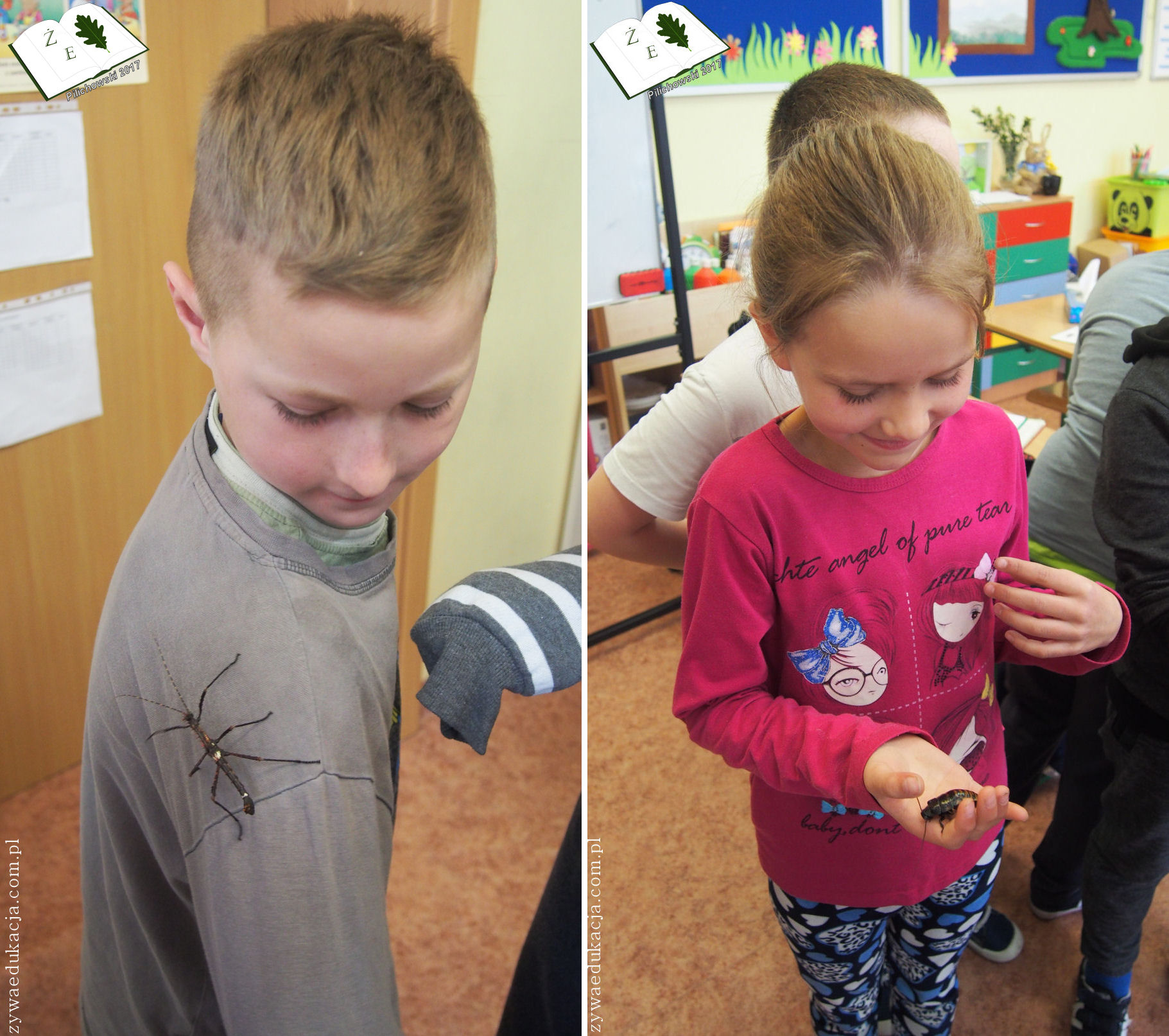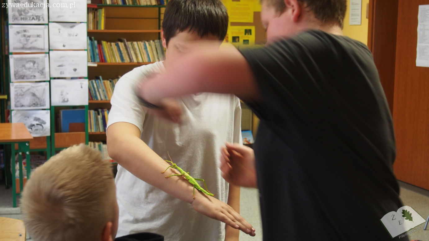 Piątek był dość pracowitym dniem. Niby weekend tuż tuz, ale swoje trzeba jeszcze zrobić. Choć praca wymagająca sił i głosu, to zarazem przyjemna - dwie grupy przedszkolne i trzy szkolne, czyli łącznie pięć grup dzieci i uczniów do pobudzenia wrażliwości na przyrodę. Temat główny? Owady. Ich rola, różnorodność, no i oczywiście część pokazowa, czyli bezpośredni kontakt z żywymi, dość sporymi niekiedy okazami owadów. Wielu skusiło się na wzięcie na ręce niektórych karaczanów i/lub straszyków, a co cieszy chyba najbardziej, że znaleźli się i tacy, którzy przełamali strach i obrzydzenie :)