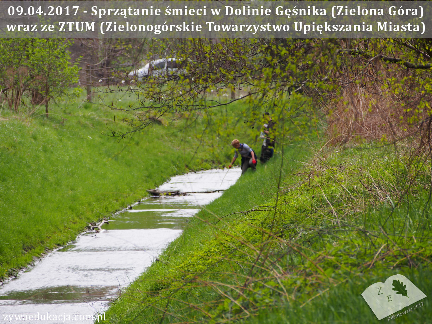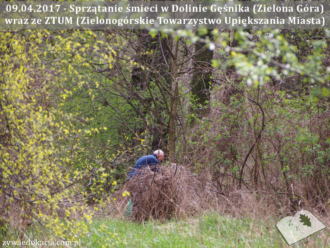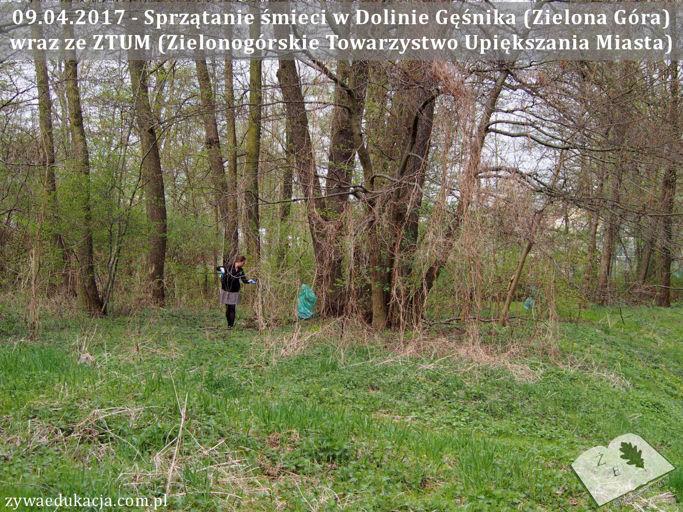 09.04.2017 odbyła się społeczna akcja sprzątania Doliny Gęśnika w Zielonej Górze. Akcja została zorganizowana przez Zielonogórskie Towarzystwo Upiększania Miasta (ZTUM) (sprawdź link) i była kontynuacją zeszłorocznej inicjatywy mieszkańców okolicy ulicu Ruczajowej w Zielonej Górze. Na oko w akcji wzieło udział 60 osób w różnym wieku, pojawili się również członkowie zielonogórskiego, dopiero formującego się, oddziału Greenpeace. Zbiórka miała miejsce przy ulicy Źródlanej o godzinie 11. Po około dwóch godzinach zaplanowane było ognisko, które oczywiście odbyło się. Tym bardziej, że pogoda dopisała.