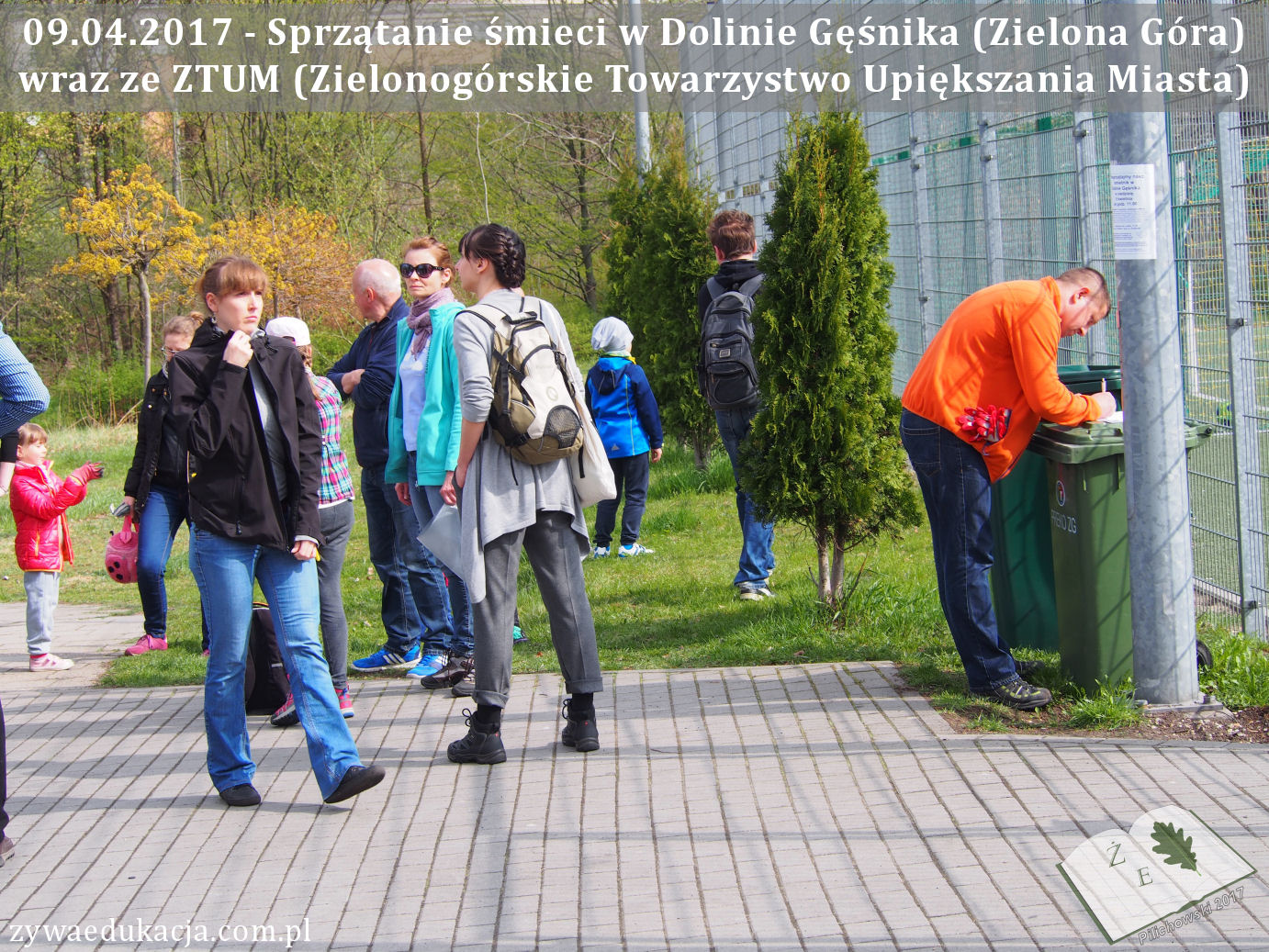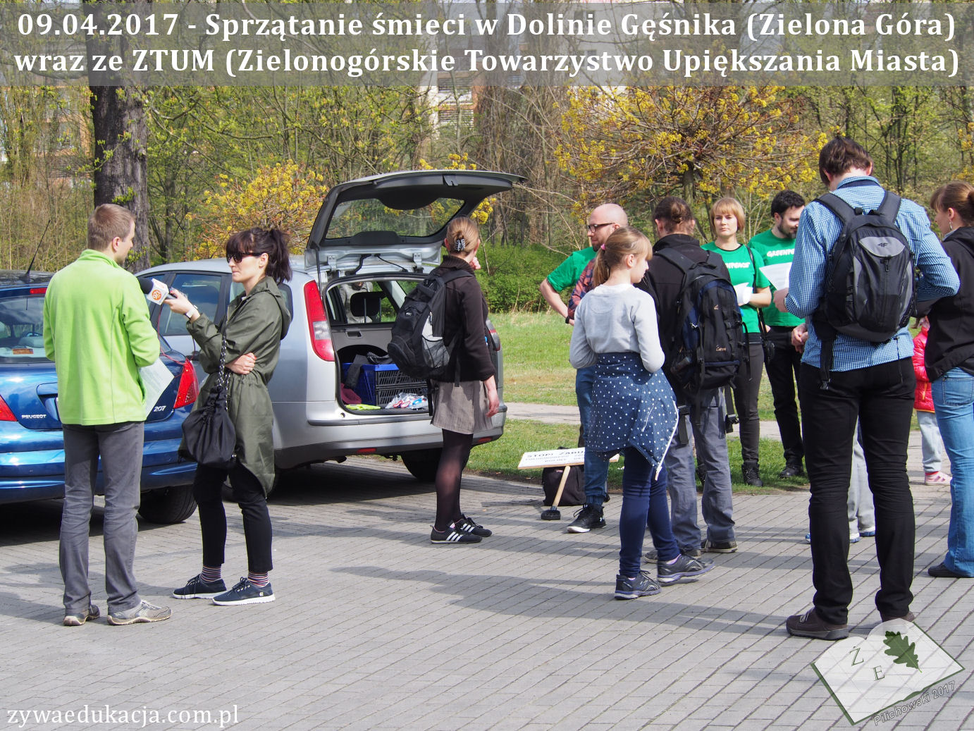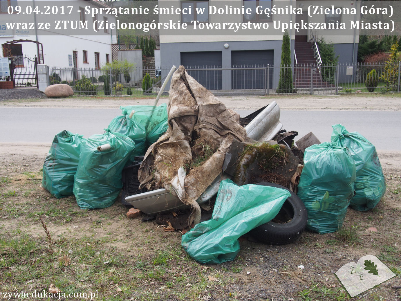 09.04.2017 odbyła się społeczna akcja sprzątania Doliny Gęśnika w Zielonej Górze. Akcja została zorganizowana przez Zielonogórskie Towarzystwo Upiększania Miasta (ZTUM) (sprawdź link) i była kontynuacją zeszłorocznej inicjatywy mieszkańców okolicy ulicu Ruczajowej w Zielonej Górze. Na oko w akcji wzieło udział 60 osób w różnym wieku, pojawili się również członkowie zielonogórskiego, dopiero formującego się, oddziału Greenpeace. Zbiórka miała miejsce przy ulicy Źródlanej o godzinie 11. Po około dwóch godzinach zaplanowane było ognisko, które oczywiście odbyło się. Tym bardziej, że pogoda dopisała.