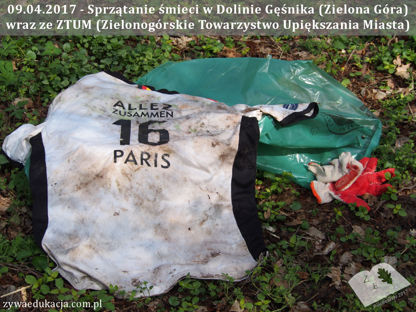 Śmieci nie było końca. Niektórzy żartowali, że można by cały samochód złożyć. Masa części samochodowych, klasycznych butelek i folii, ale i zakopany płócienny wór, koszulka jak poniżej, obuwie, elektronika... Bioracy udział w akcji zostali wyposażeni przez ZGKiM w worki na śmieci. Teraz tylko ZGKiM musi wywieźć pełne wory odpadów i Dolina Gęśnika zyska nowe oblicze.