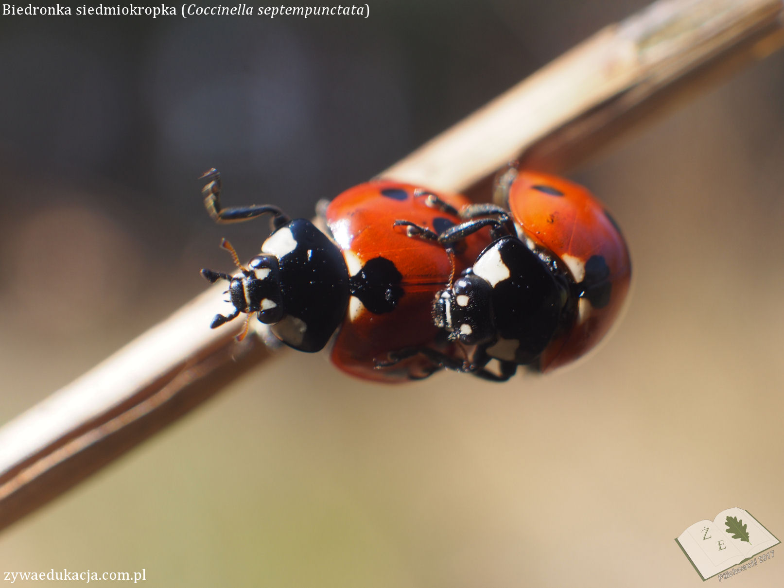 Udało się przyłapać na "gorąco" biedronki siedmiokropki (Coccinella septempunctata), kopulujące beztrosko. Z góry spoglądał na nie darownik przedziwny (Pisaura mirabilis). Darowniki mają niesamowicie ciekawe zachowania godowe, otóż samiec biega z oplecioną przędzą ofiarą, np. muchą i szuka samicy.