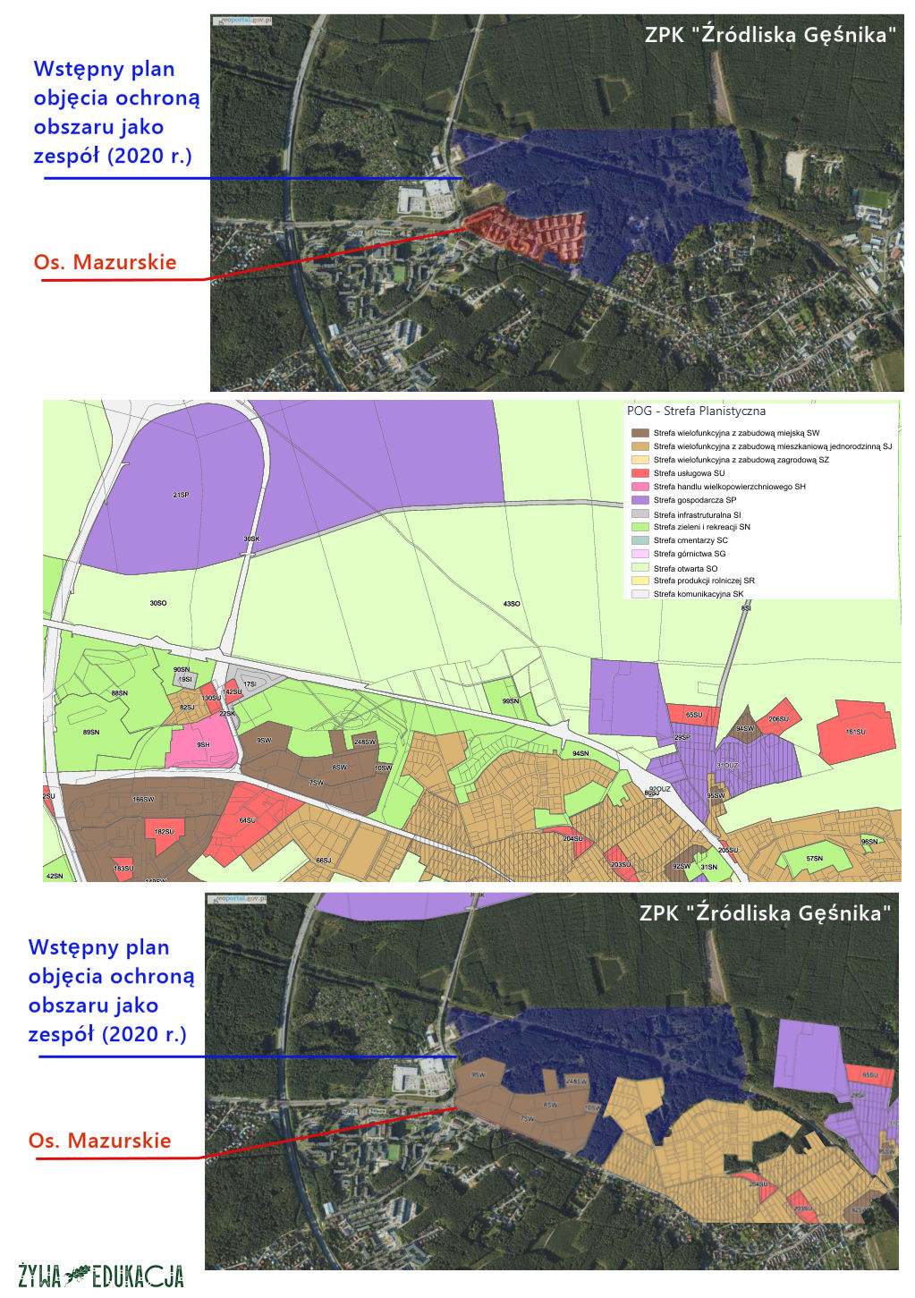 Projekt planu miejscowego i kierunków zagospodarowania w odniesieniu do projektowanego zespołu przyrodniczo-krajobrazowego "Źródliska Gęśnika" (w północnej części zwraca uwagę wracająca co jakiś czas informacja o rozszerzeniu strefy gospodarczej/ fiolet):