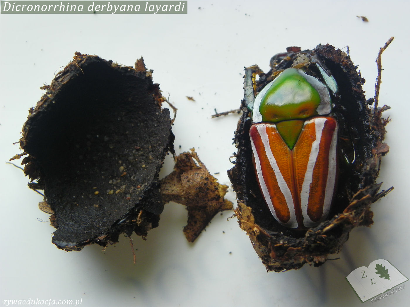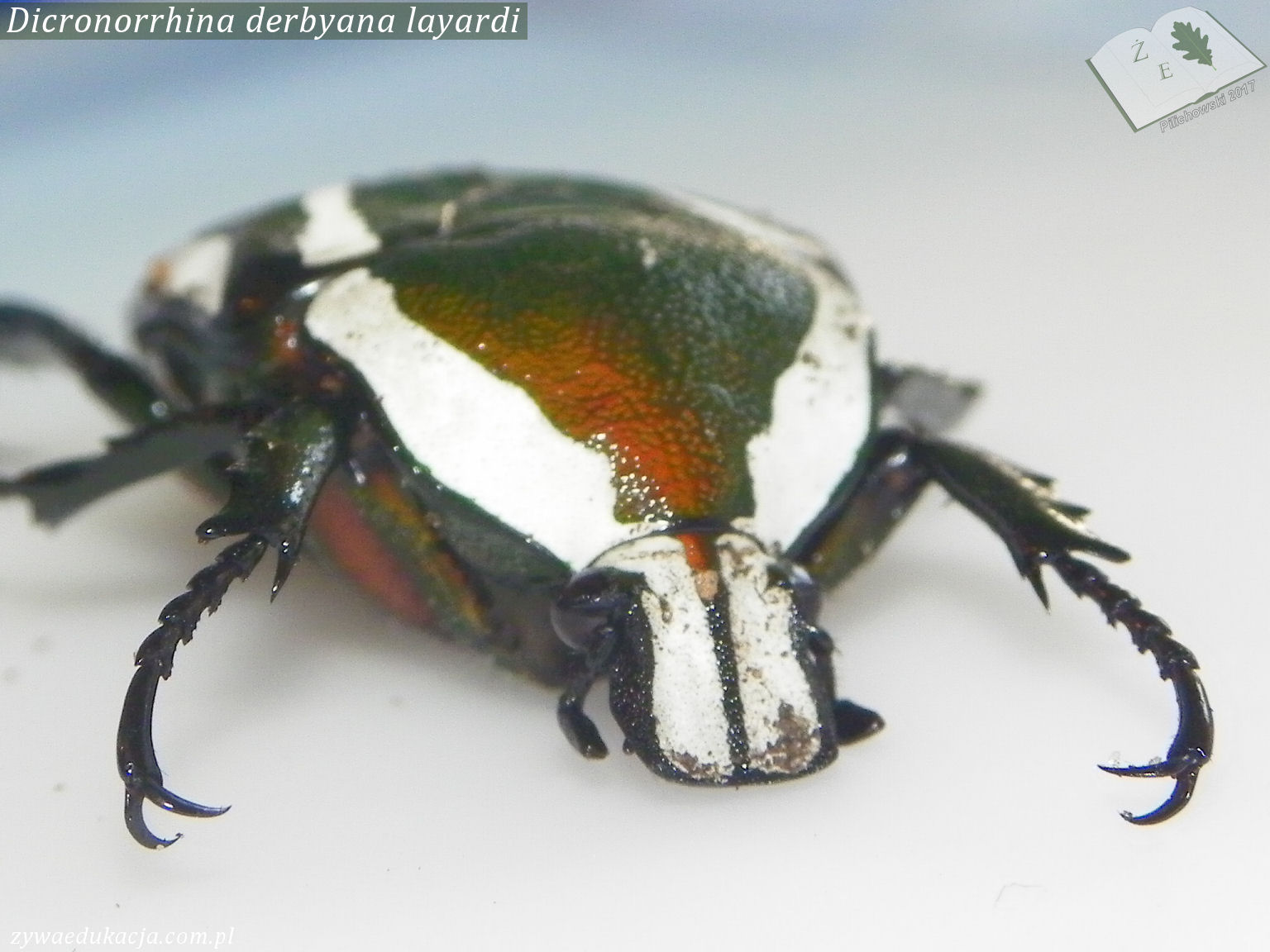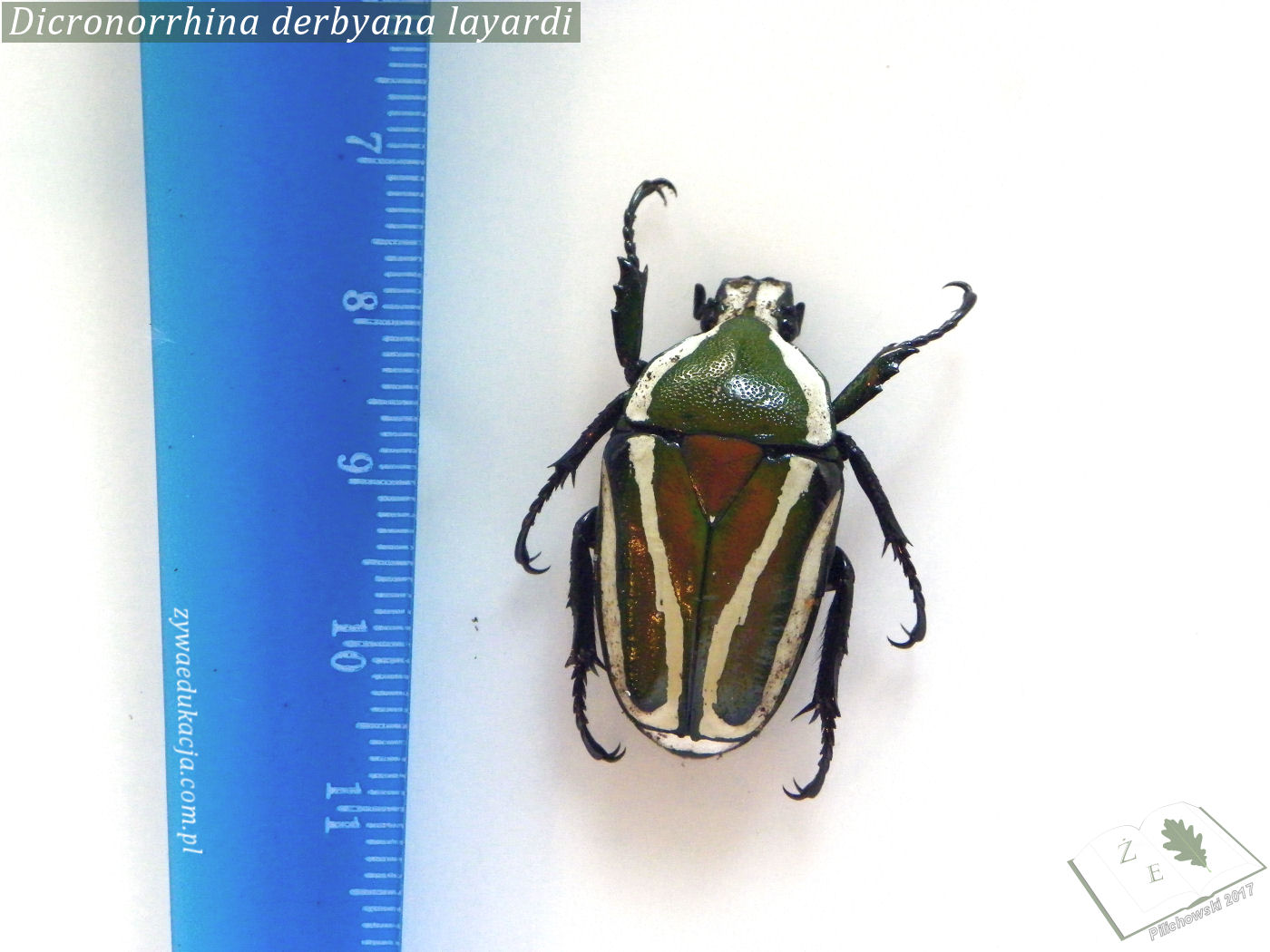 Imagines: Metaliczne ubarwienie (zieleń z rdzawym, mieniącym się deseniem). Pokrywy skrzydłowe w podłużne, skośnie przebiegające pasy - zielone i białe. Samiec z "rogiem". Długość ciała (DC): ok. 4 cm, do 5 cm u samców. Pędraki typowe dla rodziny.