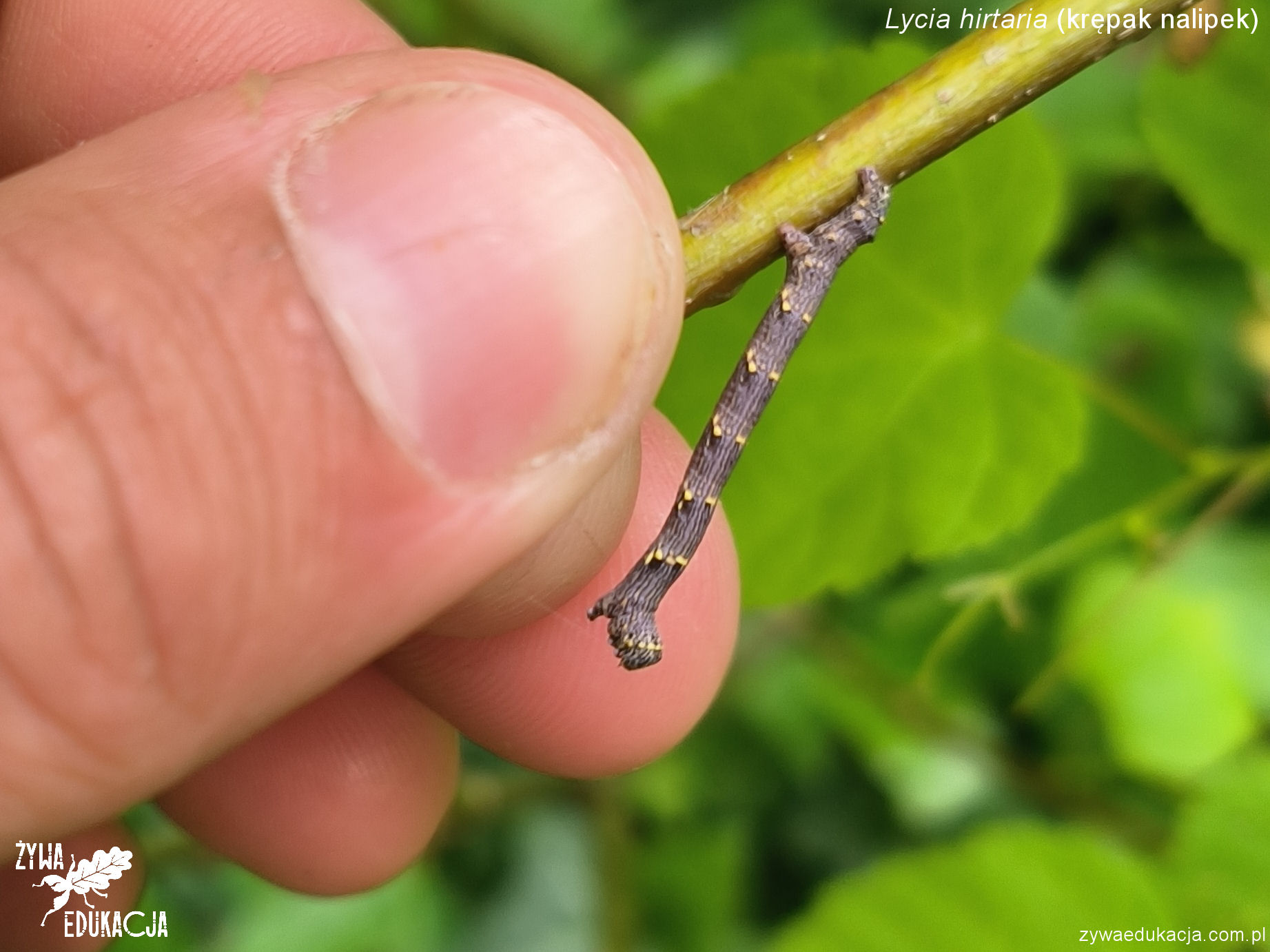 | Gąsienice namiotnika trzmieliniaczka Yponomeuta cagnagella: | Gąsienica krępaka nalipka Lycia hirtaria niczym odstająca gałązka na lipie. |