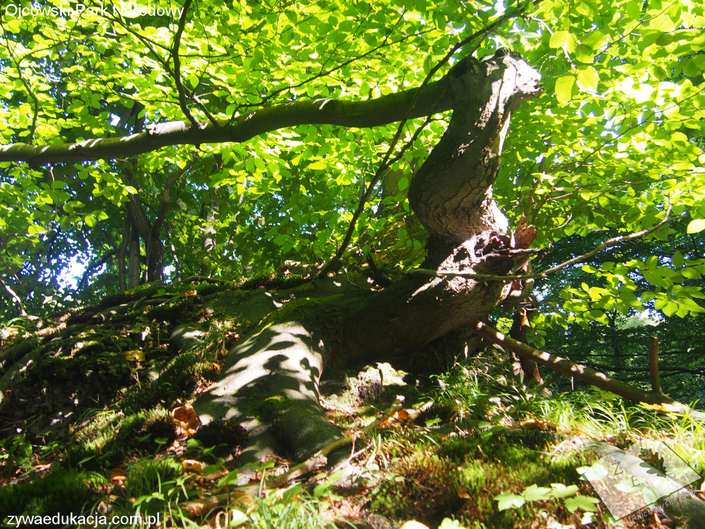 Na jednym z wyniesień, na wapiennym bloku rośnie najpiękniejszy buk (Fagus sylvatica L.), jaki w życiu widziałem. Główny pień ułamany, dolny konar wygięty w kierunku poziomym, drugi łukowato ku górze. Potężne korzenie oplatające skałę, a wokół paprocie zanokcice i paprotki, pośród mchów i innych niskich roślin.