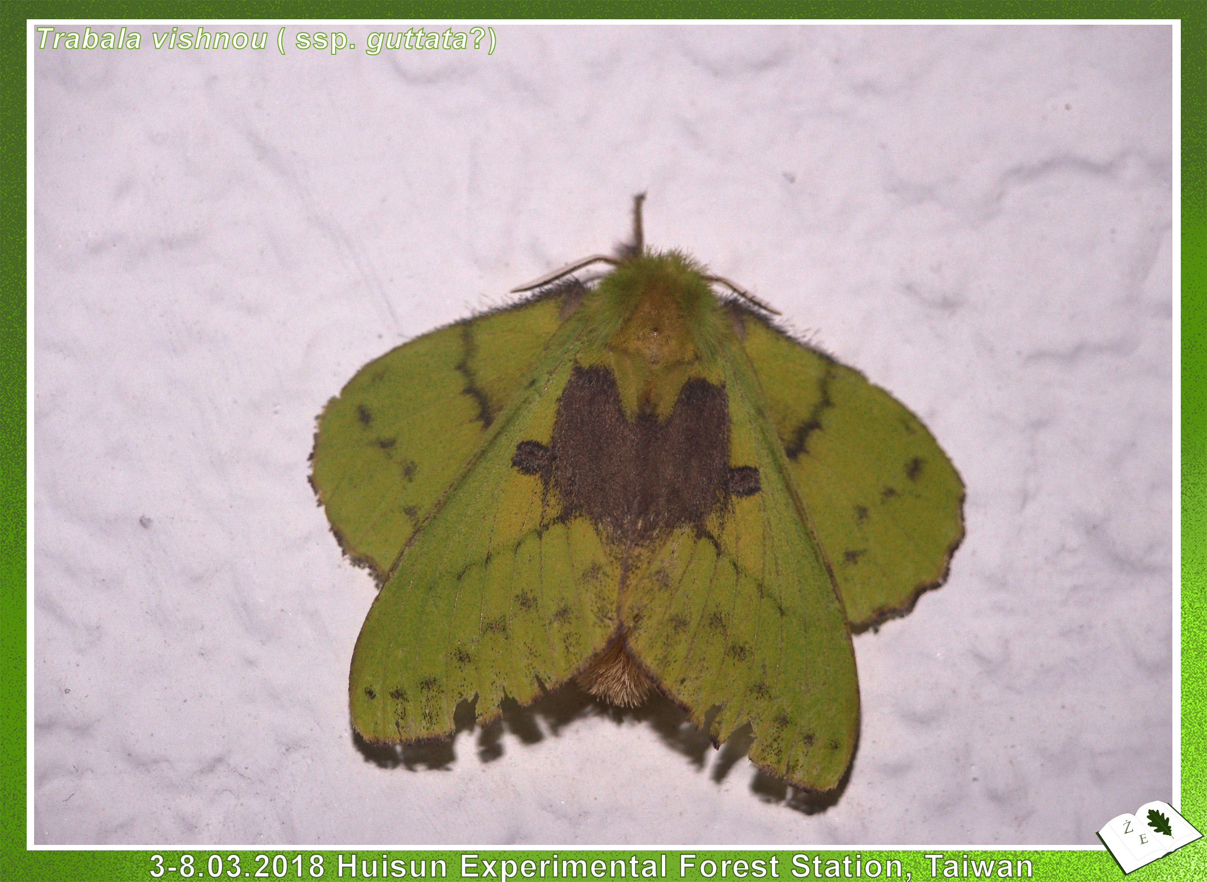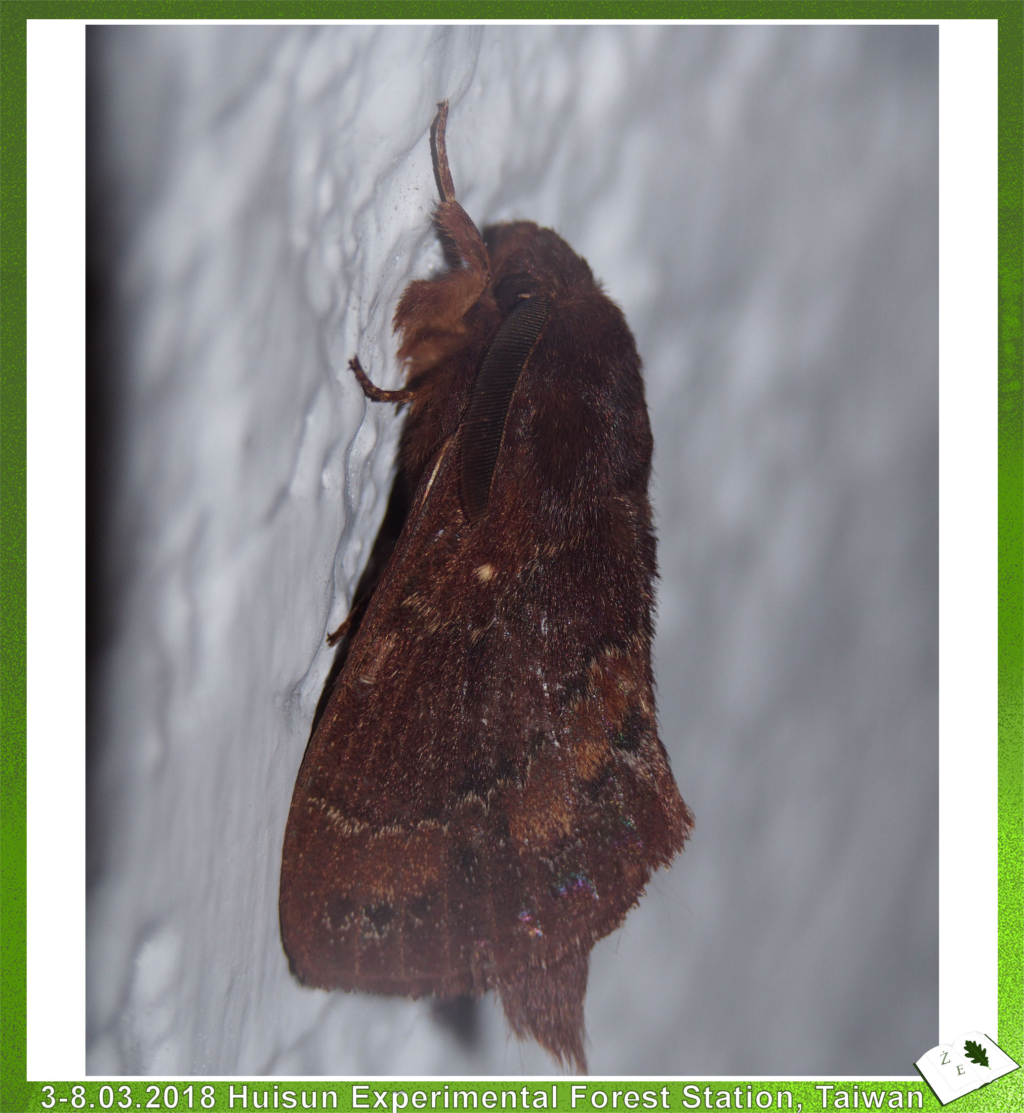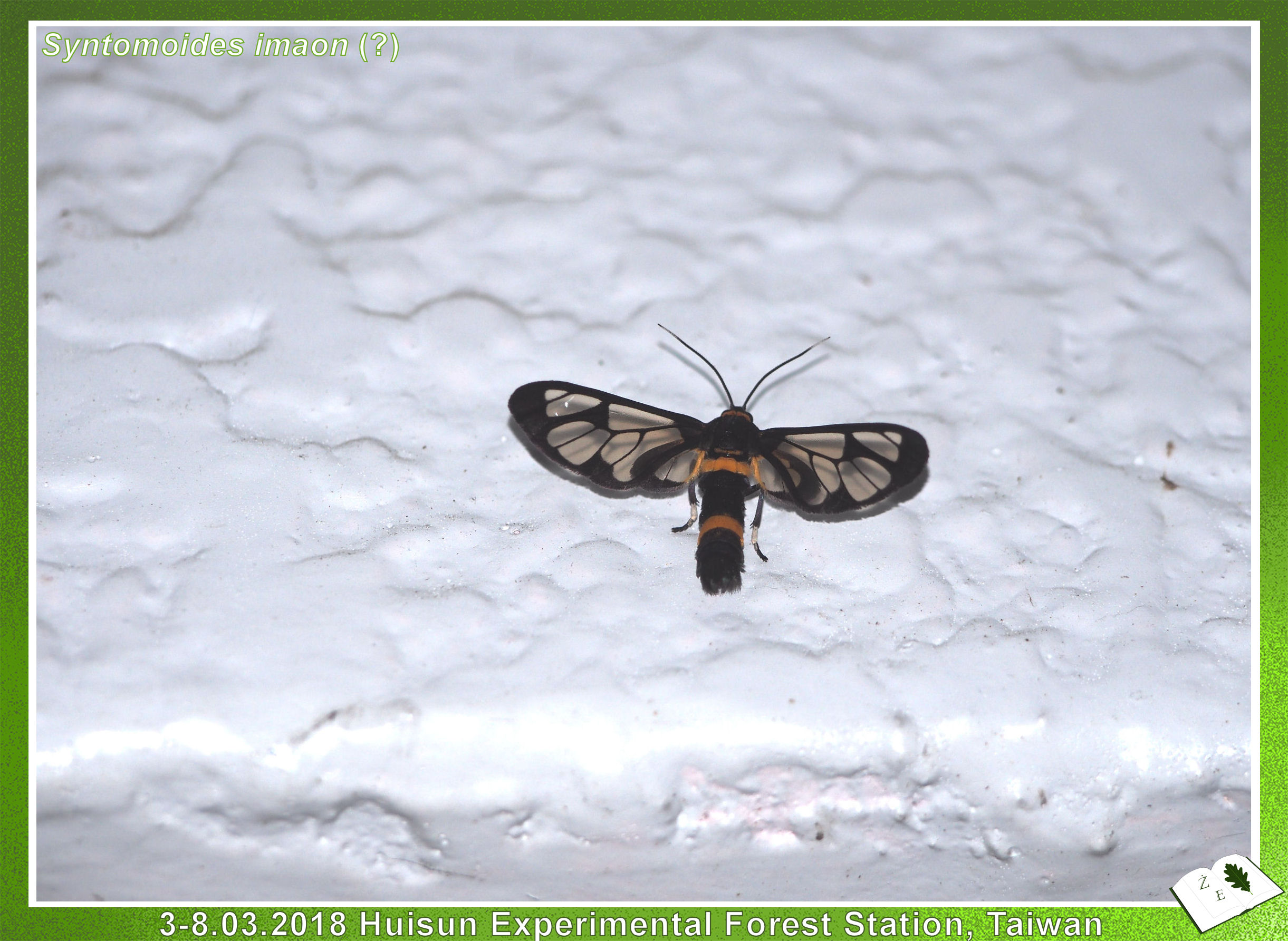 Widziałem ich naprawdę dużo, trochę zawisaków (Sphingidae) - największe wrażenie zrobiły ogromne fruczaki (Macroglossum sp.) pożywiające się o zmierzchu wśród kwiatów azalii. Fruczaki jak to fruczaki - ciągle w ruchu, zrobić im zdjęcie, które choć trochę zadowoli to sztuka przy zupełnie sztucznym oświetleniu... Chyba całkiem nie najgorsze mi wyszło (powyżej) - widać na nim długą ssawkę. Pięknego, zielonego zawisaka znalazłem w centrum turystycznym stacji Huisun, ale niestety rozdeptanego... Zazdroszczę uczestnikom sympozjum, którzy mieli ulotną okazję zobaczyć pawicę z rodzaju Actias (hodowałem kiedyś inne gatunki z tego rodzaju - kliknij). Z ciekawych ciem jeszcze udało mi się znaleźć jednego zielonego (samiec?) osobnika z rodzaju Trabala (stawiam na Trabala vishnou, podgatunek guttata) (rodzina barczatkowate; Lasiocampidae). Podobnie w kilku miejscach na Tajwanie widziałem osopodobnego motyla z gatunku (najpewniej) Syntomoides imaon. Szczerze mówiąc, myślałem, że ten motyl należy do rodziny przeziernikowatych (Sesiidae; występują również w Polsce), znane z upodabniania się do żądłówek (osa, pszczoła). Ale tak śledzę tę systematykę i widzę, że nie. Otóż rodzaj Syntomoides klasyfikowany jest w rodzinie mrocznicowatych (Erebidae), podrodzinie niedźwiedziówkowatych (Arctiinae).