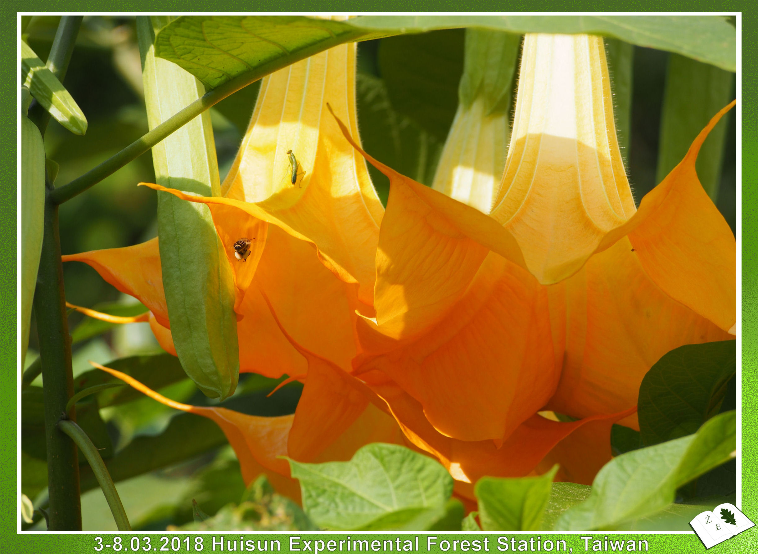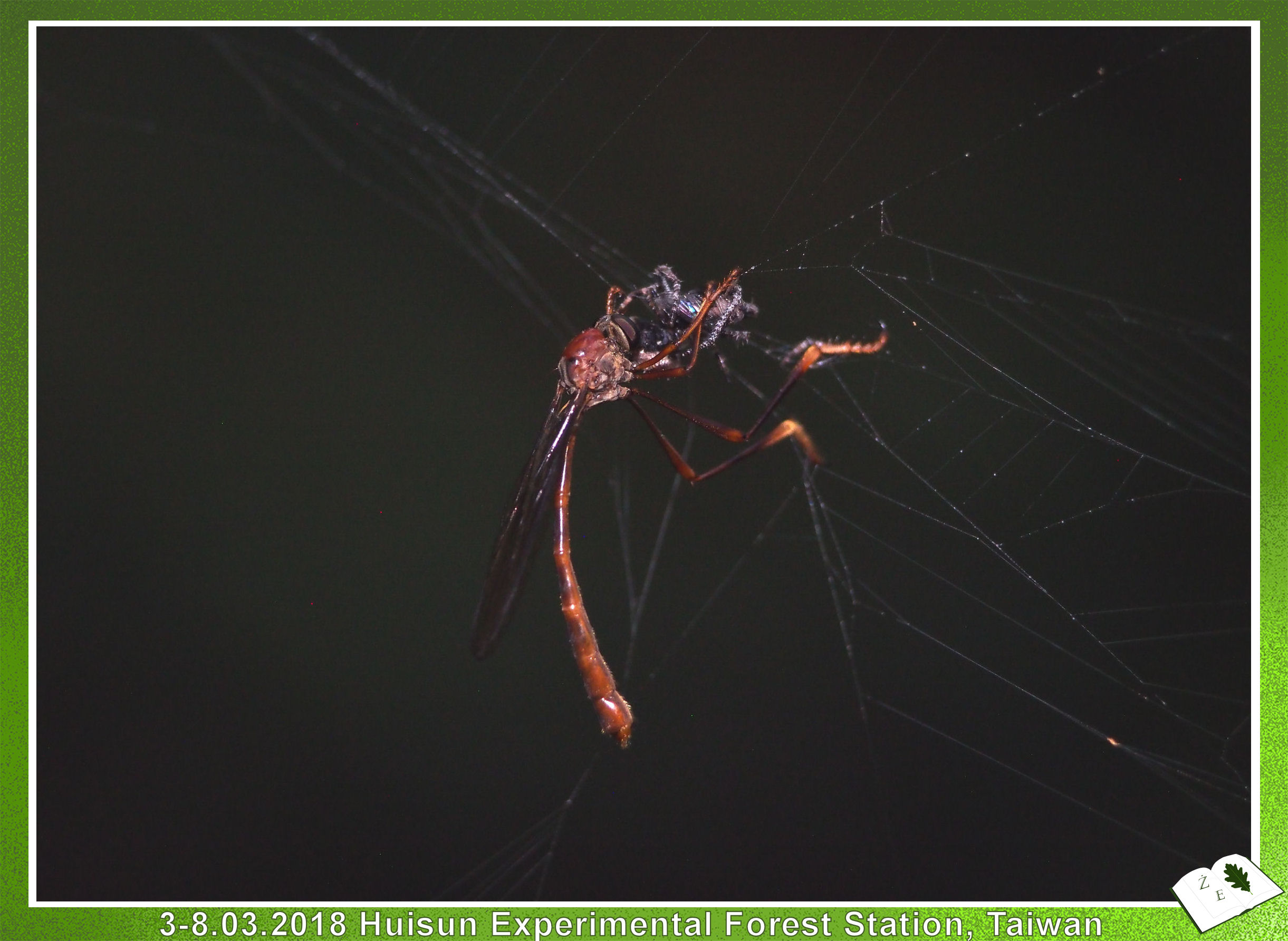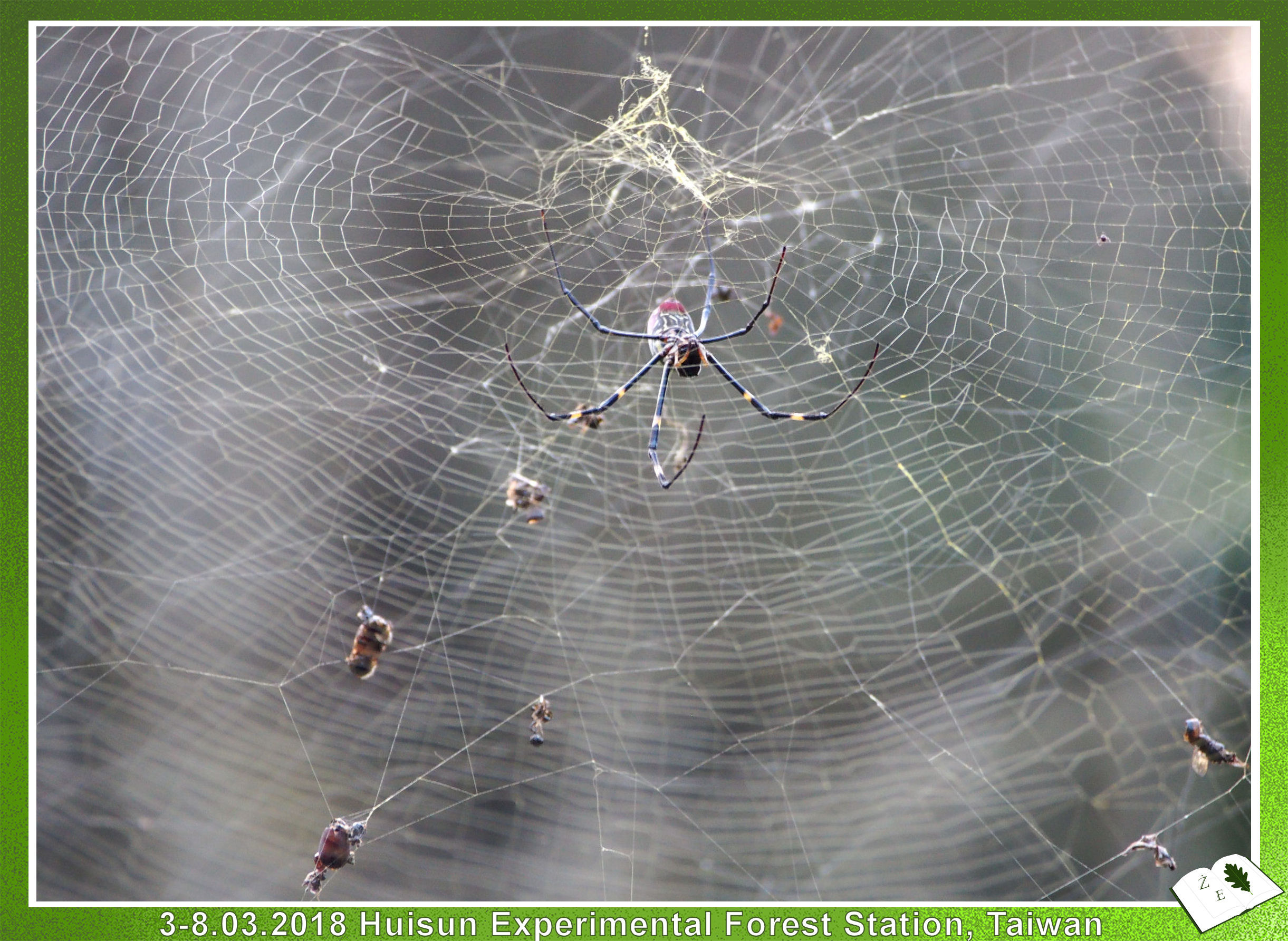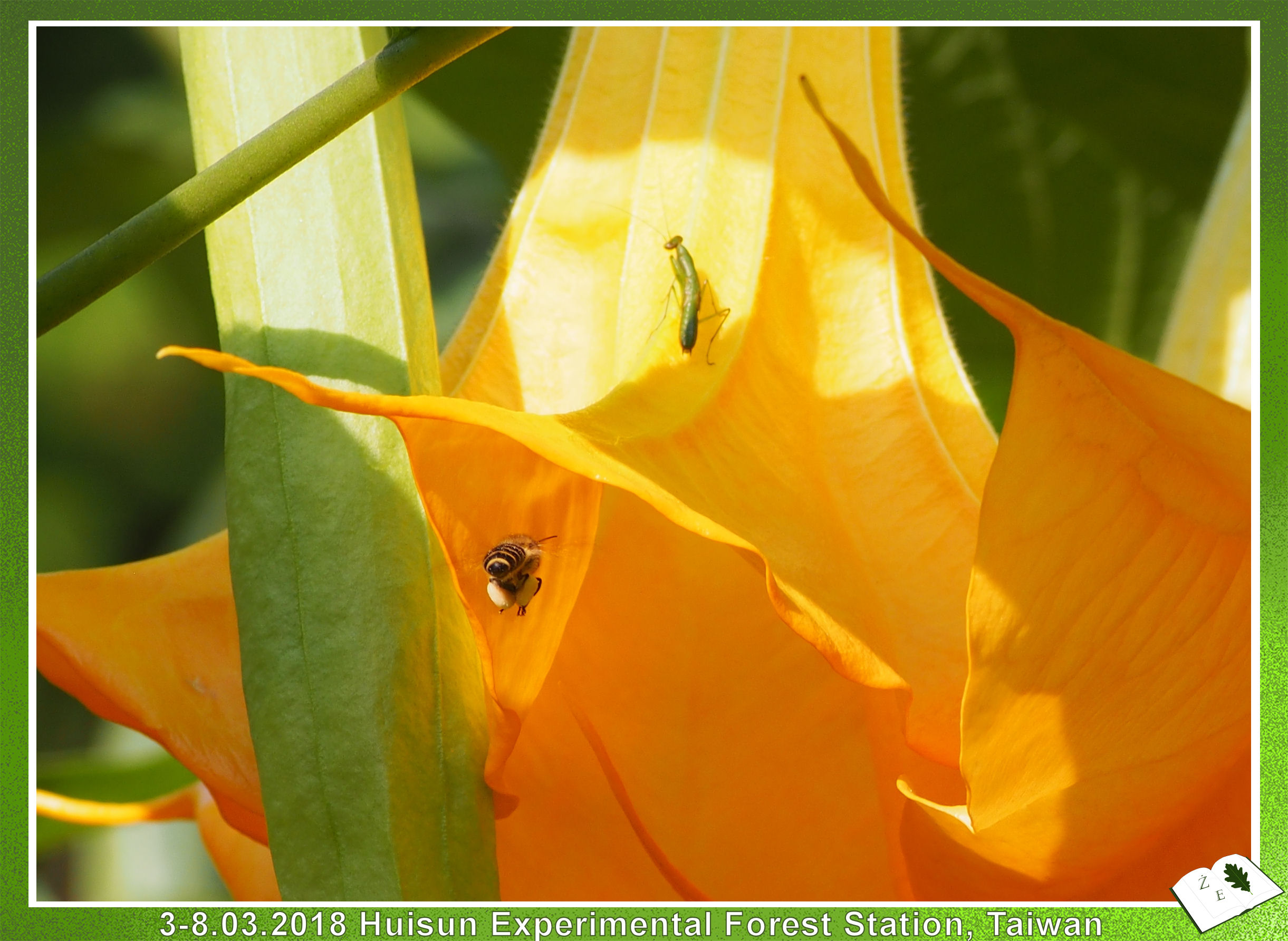 Poza motylami, oczywiście, widziałem sporo innych bezkręgowców, aczkolwiek mam pewien niedosyt. Chyba drugi dzień w Huisun dał możliwość spotkania szerokiej gamy owadów wygrzewających się na nasłonecznionych daturach czy wręcz korzystających z ich potężnych kwiatów. Na intensywnie pracujące pszczoły czekały cierpliwie modliszki (wśród nich chyba Odontomantis planiceps Giglio-Tos, 1913), ale i swe sieci budowały tygrzyki (przypuszczalnie Argiope aemula Walckenaer, 1841), przypominające nasze tygrzyki paskowane (kliknij i zobacz). Oba gatunki tych pająków różnią się jednak rysunkiem na ciele oraz wzorem stabilimentum na sieci.