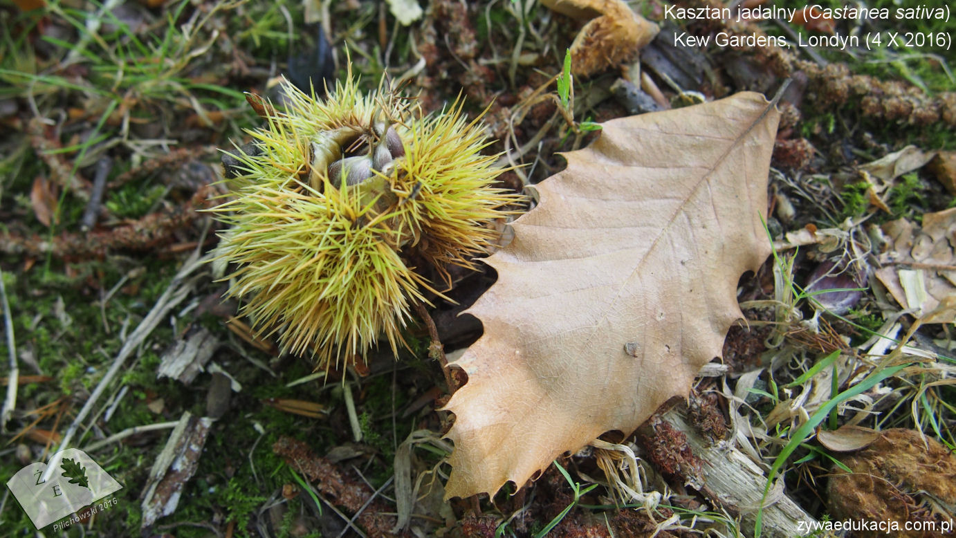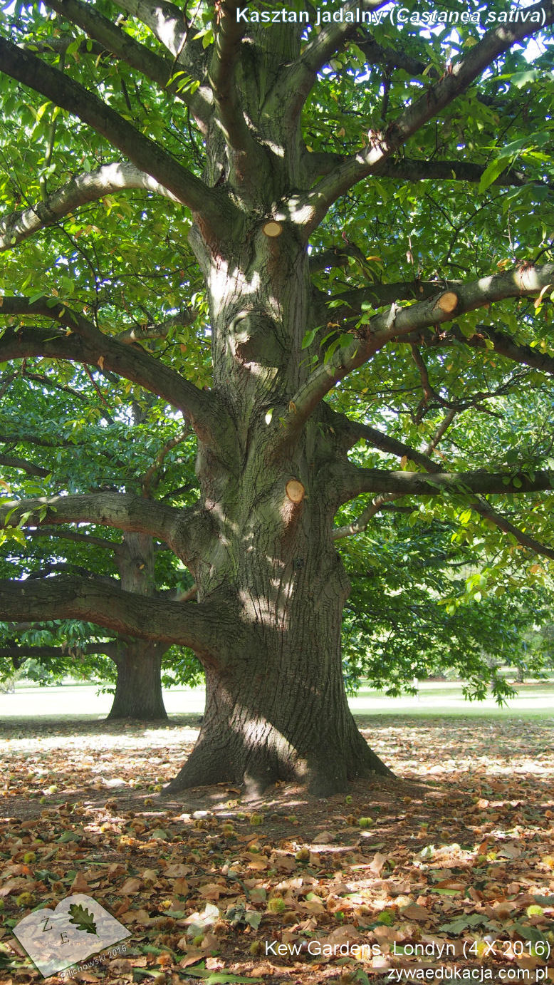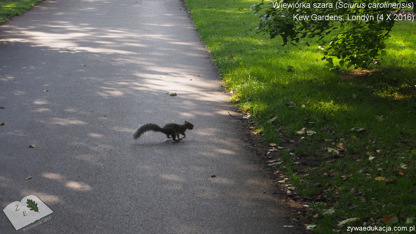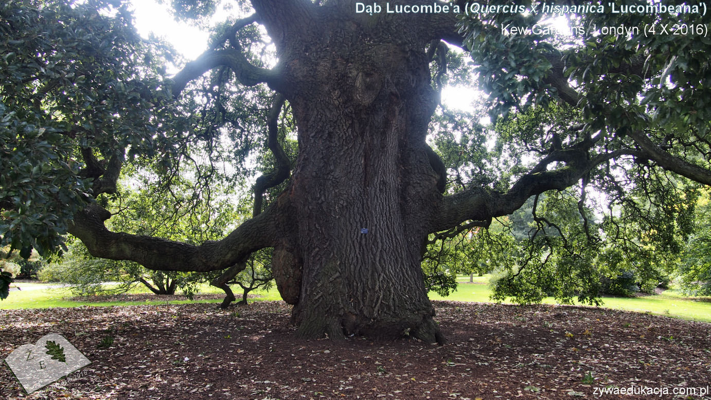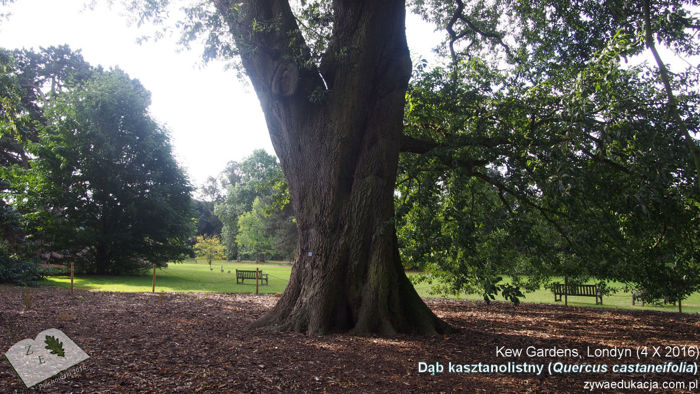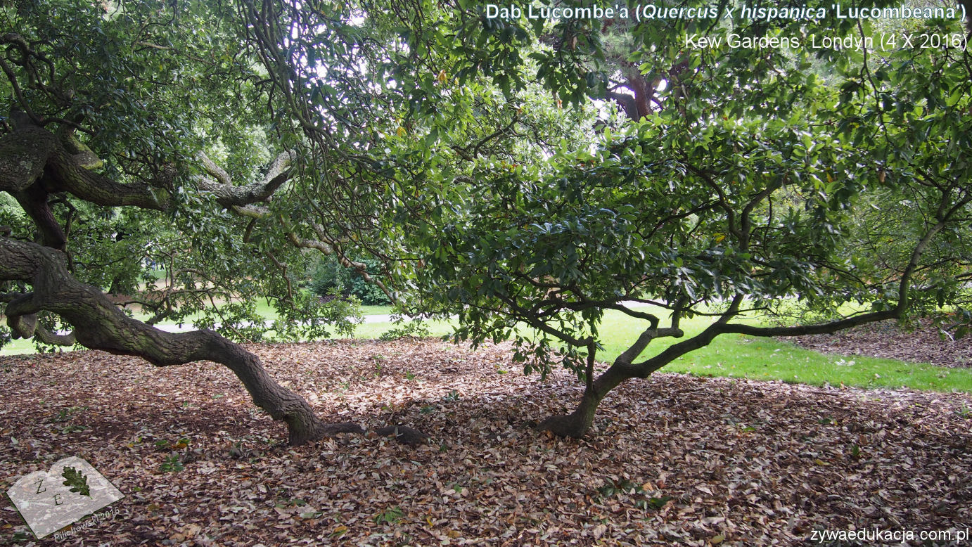 4 października 2016 moja stopa, ba nawet obie, przekroczyła próg królewskich ogrodów Kew Gardens w Londynie. Choć pobyt w Londynie trwał jeden dzień, a w Kew byłem jedynie kilka godzin, to moje wewnętrzne ja raduje się tym, co zobaczyłem. Miła obsługa na wstępie, mapa Ogrodów, masa ludzi przygotowujących poletka na przyszłosezonowe rabaty i zabezpieczająca okazałe drzewa, rozsypując torf wokół bryły korzeniowej. No i szklarnia... A dalej wspaniałe dęby, w tym dwa stanowiące dziedzictwo Kew Gardens - dąb kasztanolistny Quercus castaneifolia, posadzony w 1846 roku oraz dąb Lucombe'a Quercus x hispanica 'Lucombeana', posadzony w 1773 roku. Ten ostatni to mieszaniec o cechach dębu burgundzkiego Q. cerris oraz korkowego Q. suber, odkryty przez Williama Lucombe'a w 1765 roku. Tabliczka informacyjna podaje, że najprawdopodobniej niniejsze drzewo to jedno z pierwszych sadzonek Lucombe'a. Sam osobnik rosnący w Kew Gardens to potwornej wielkości i o potężnej koronie drzewo, o ciekawie skierowanych ku ziemi gałęziach, w pełni ulistnionych. Oczywiście poza nimi znajdziemy tam liczne dęby od szypułkowego Q. robur, bezszypułkowego Q. petraea i czerwonego Q. rubra, po dąb burgundzki odmiany 'Laciniata' Q. cerris 'Laciniata', korkowy Q. suber i inne. Niemniej imponujące są potężne cedry atlaskie Cedrus atlantica, w tym odmiana sina 'Glauca', cedr libański C. libani i himalajski C. deodara. Liczne sosny, ciekawie wyglądająca stara surmia bignoniowata Catalpa bignonioides, owocujące liczne i często spore ostrokrzew Ilex spp., kwitnące w wielu miejscach zimowity Colchicum i wiele, wiele by jeszcze opowiadać. Po drodze zapoznaliśmy się z tymczasową aranżacją Flora Japonica, edukacyjnym pakietem dotyczącym owadów zapylających, szczególnie pszczół i trzmieli, a uroku dodała wiewiórka szara Scurius carolinensis, północnoamerykański gatunek gryzonia, inwazyjny na Wyspach, niosąca w pyszczku owoc kasztana jadalnego Castanea sativa.