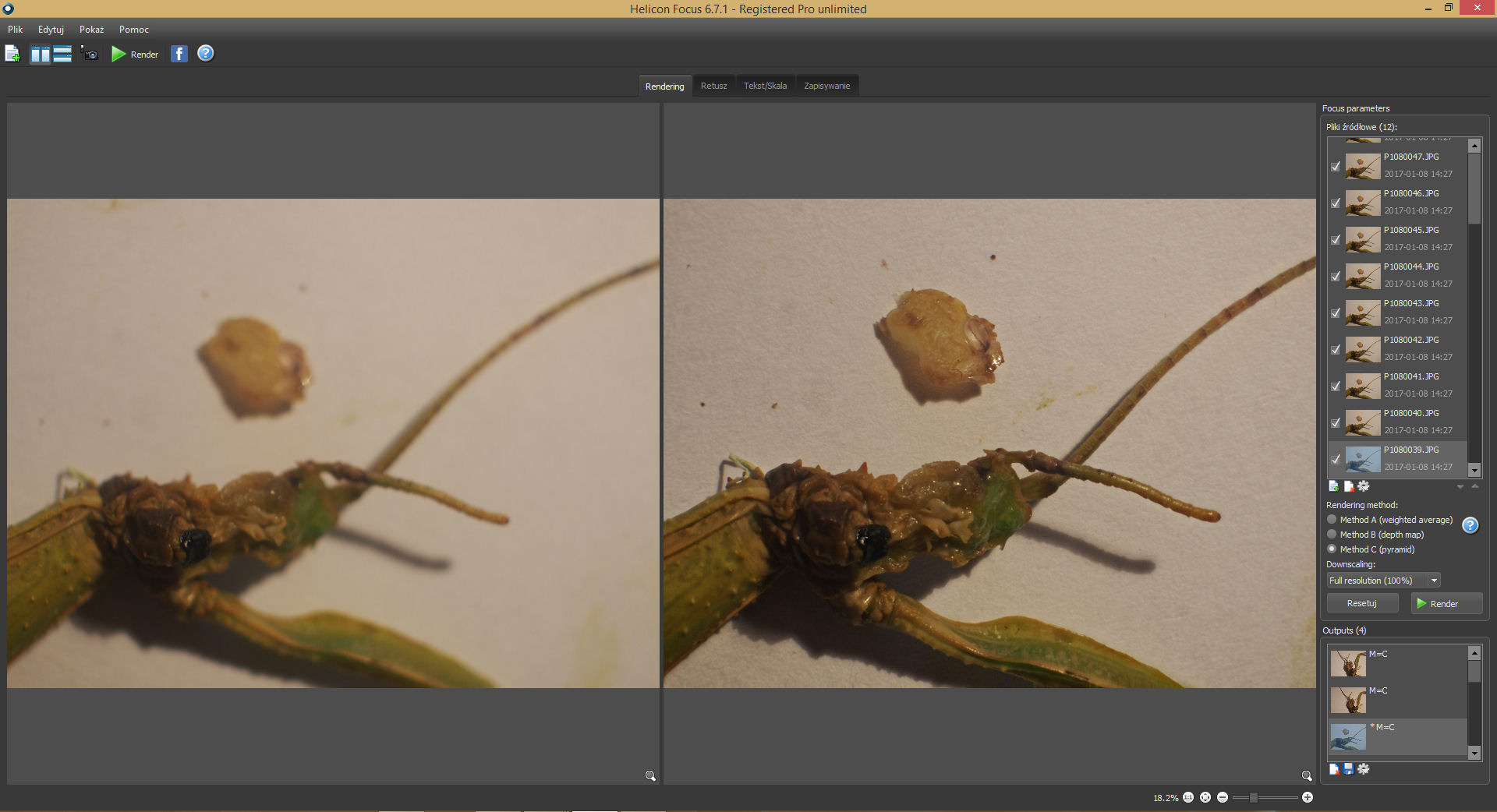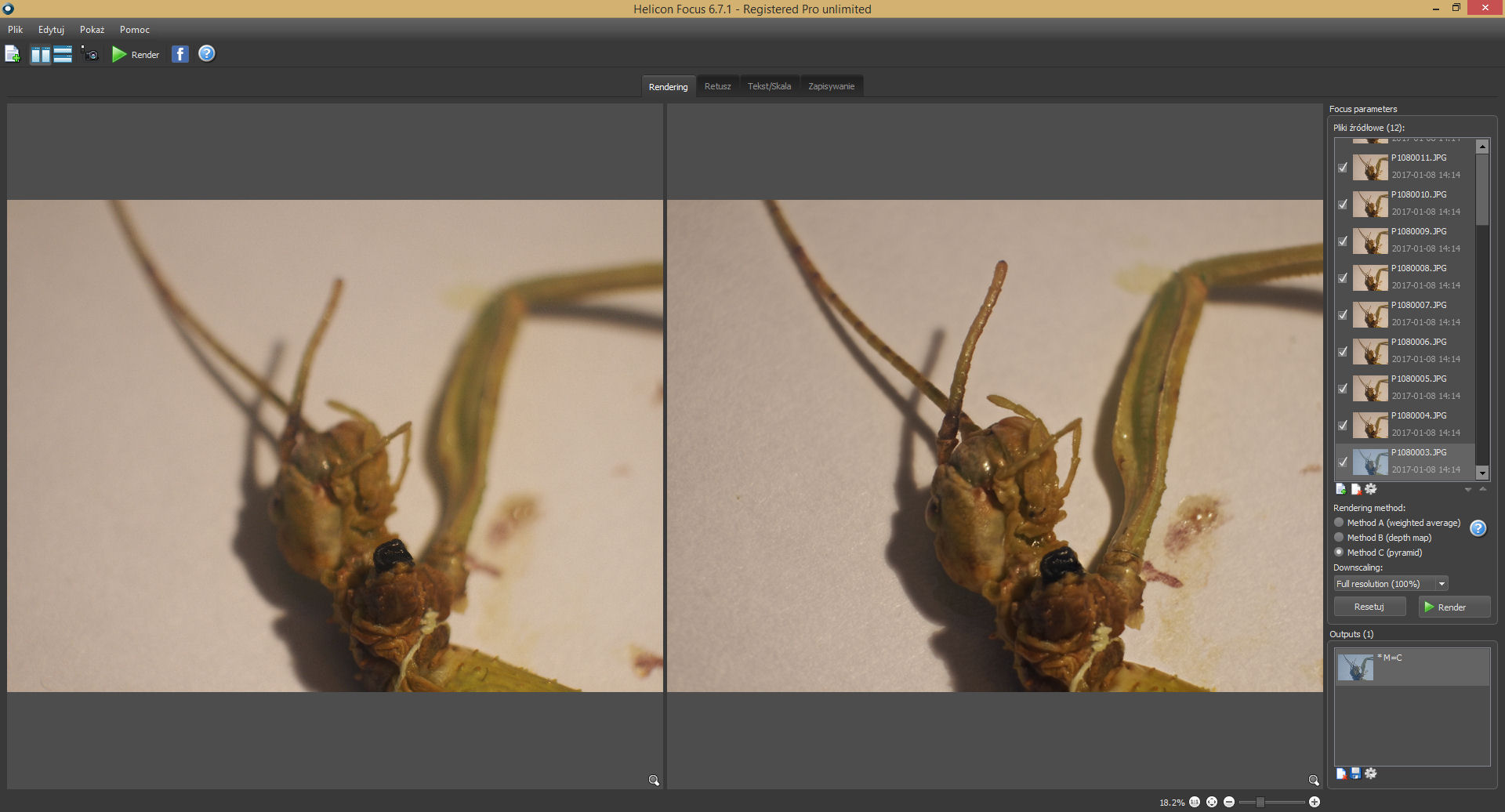 Jak wspomniałem wcześniej mamy do wyboru trzy algorytmy: A. weighted average (średnia ważona), B. depth map (mapa głębi), C. pyramid (piramida). W zależności od tego jak mamy przygotowaną sekwencję ujęć, poszczególny algorytm może dać lepszy rezultat. Najdoskonalej jest robić zdjęcia w sposób zautomatyzowany, czy to poprzez mikroskop czy aparat, z ustawionym wcześniej przeskokiem. Fotografując obiekty makro robię to zazwyczaj z "rąsi", rzadko używając statywu. Do tego stopnia leniwie, ale efektywnie, że stosując automatyczne ustawienia przy opcji wielokrotnych zdjęć. Wtenczas wyostrzam na półmigawce pierwszą górną warstwę i z każdym ujęciem zbliżam dosłownie o kawałek obiektyw do obiektu. Dużym minusem tej metody jest to, że kadr "ucieka" i wtenczas powstają kłopoty ze złożeniem. O ile jeszcze sfotografujemy obiekt w tej samej płaszczyźnie, ale nieco przesuniemy ramkę kadru, to Helicon poradzi sobie z tym i nałoży odpawiadające sobie fragmenty obiektu na siebie, ale im bardziej zmienimy kąt obiektywu w stosunku do obiektu, tym powstają większe niedoskonałości w efekcie finalnym. Kwestia prób, błędów i zaparcia.