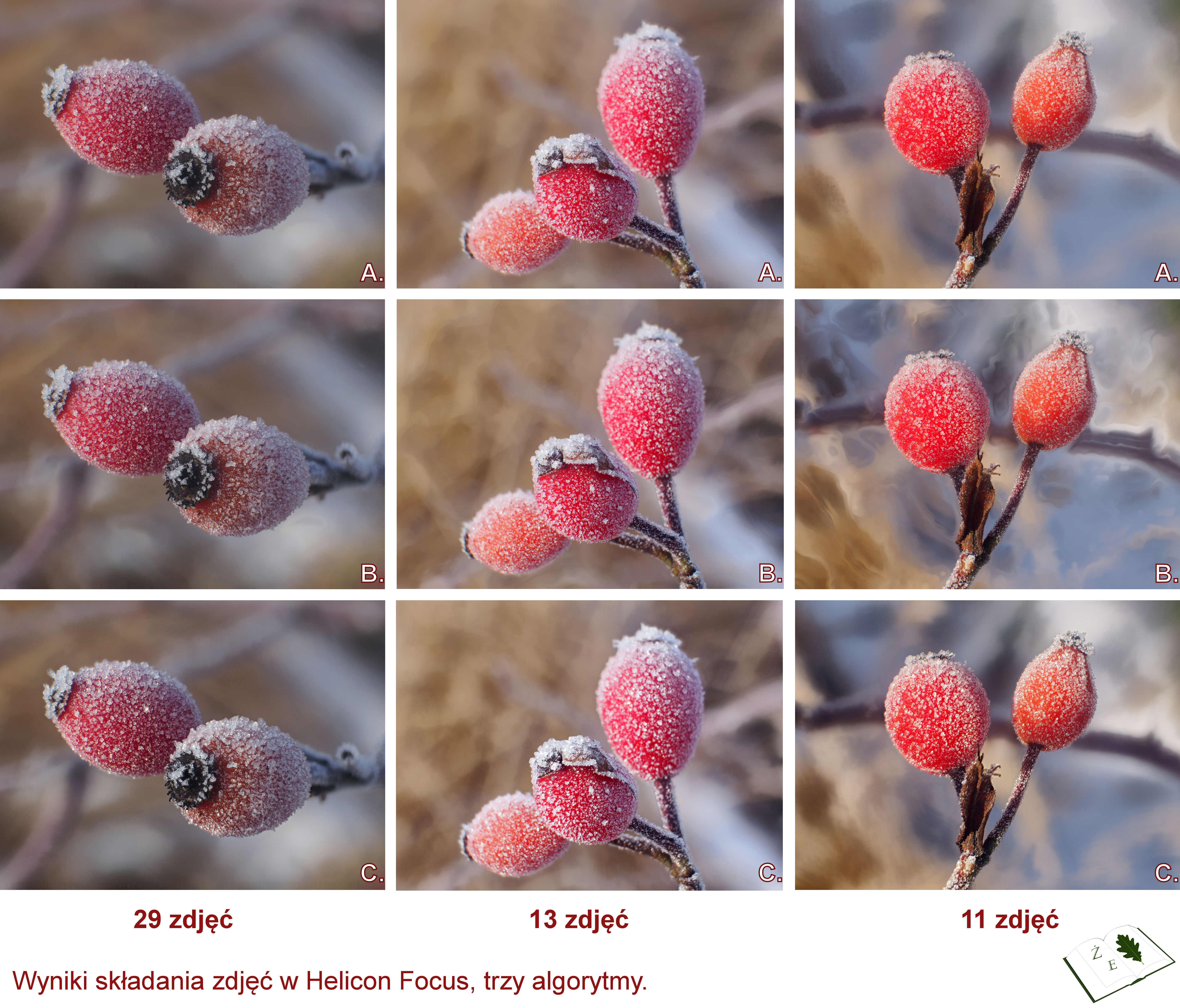 Poniżej znajduje się grafika przedstawiająca owoce dzikiej roży, fotografowanej w mroźny dzień, 6 stycznia 2017, "z rąsi". Każdy pion pokazuje efekt finalny złożony poszczególnym algorytmem. Trzecia sekwencja nieco "tańczyła" w kadrze (a raczej moja ręka), stąd powstało tyle finezyjnych rozmyć w tle. Niemniej, tablica pokazuje złożenia bez przeprowadzenia retuszu. Po kliknięciu wyświetli się w nowym oknie większy plik.