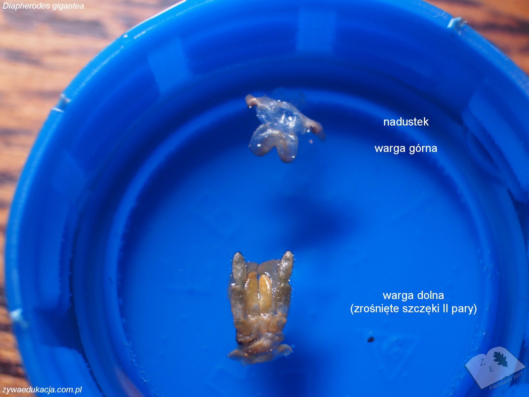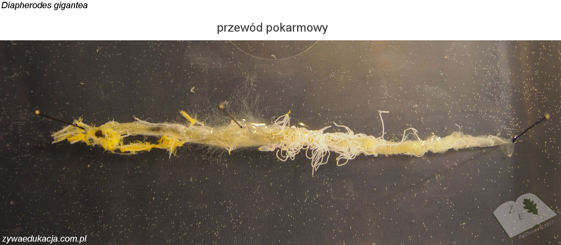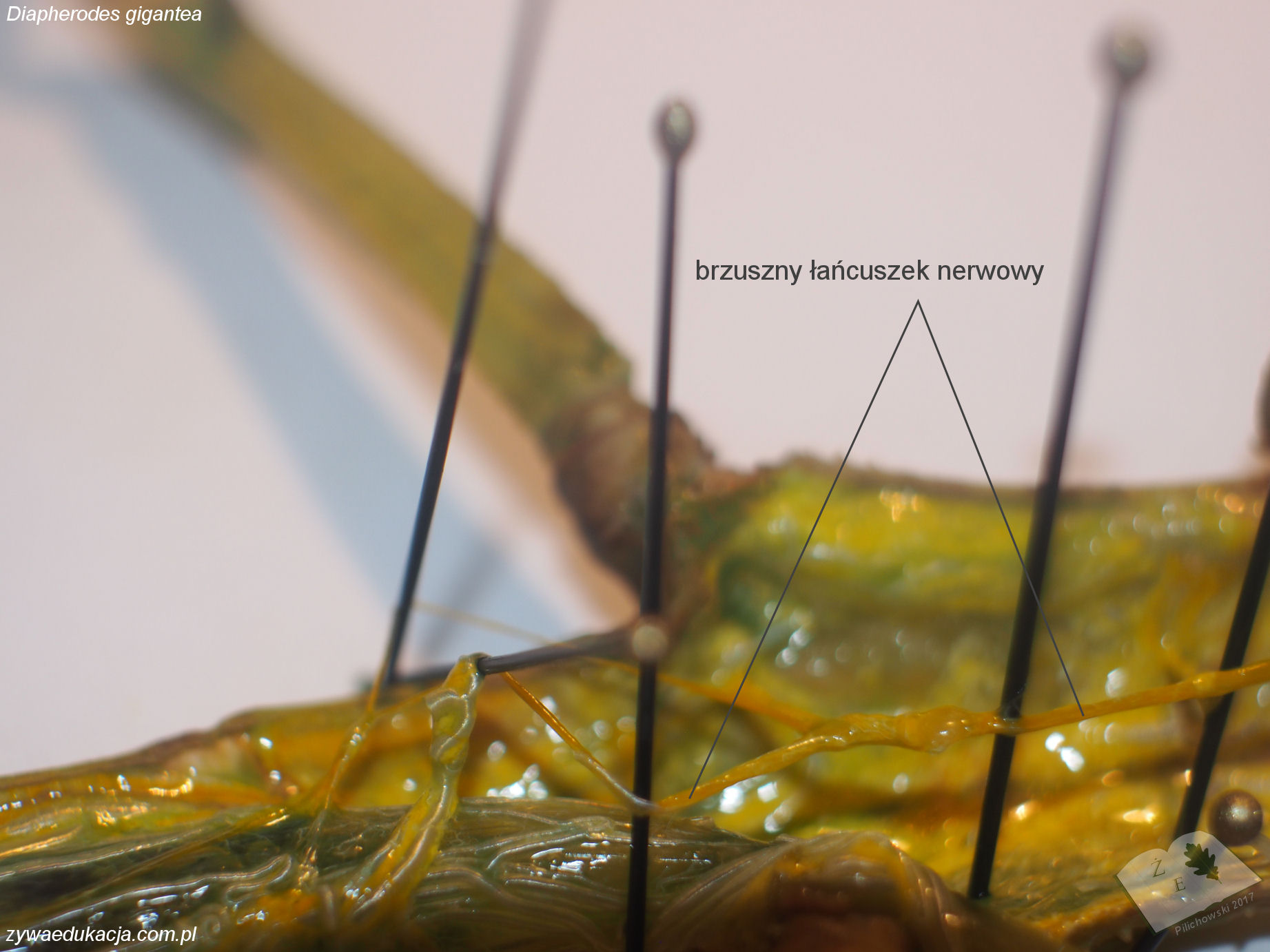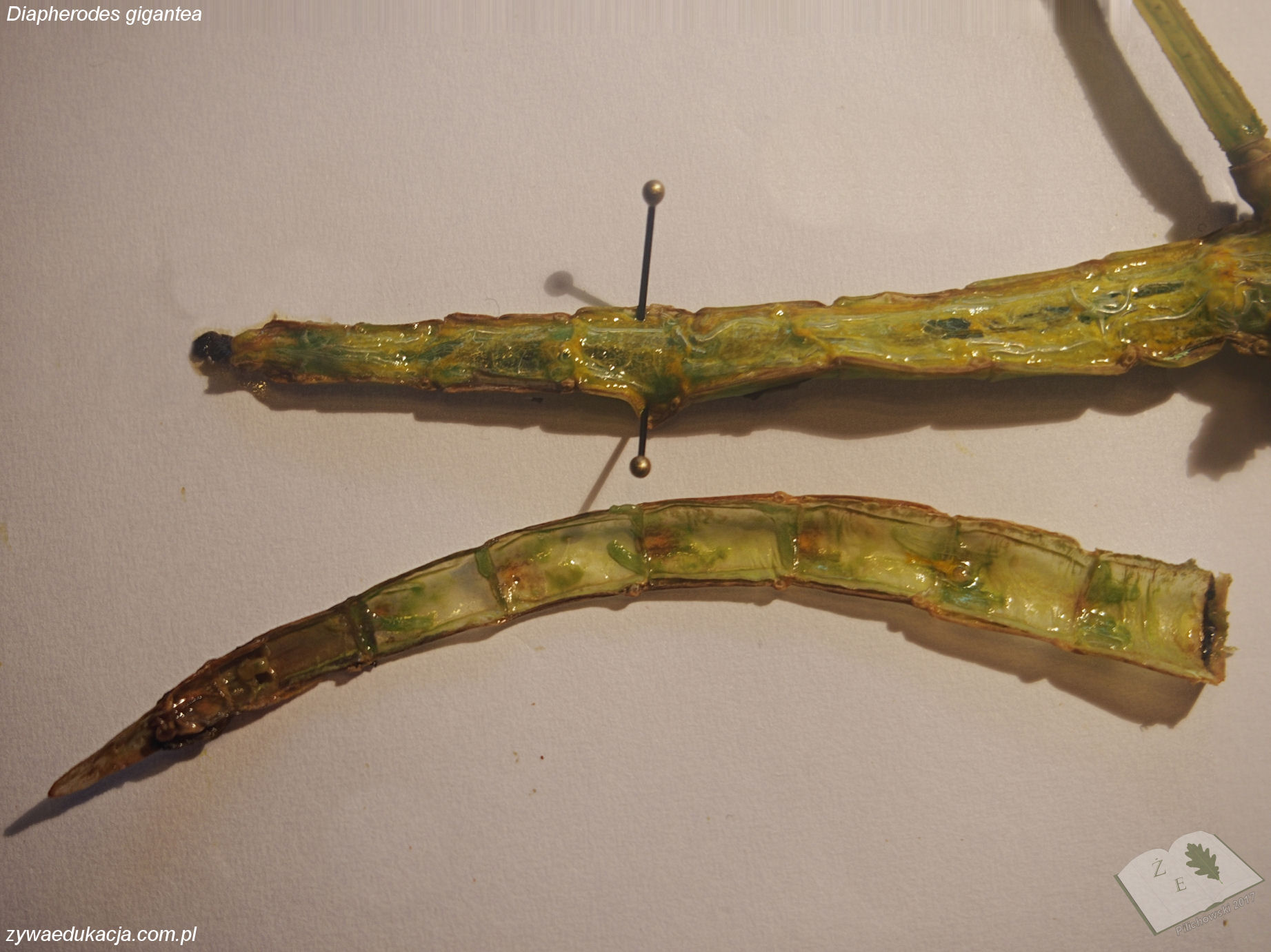 Tak samo jest z preparacją owada na zajęciach - czy to w ramach lekcji, czy po, choćby dla chętnych. Duży owad daje wielkie możliwości, a dobrze przygotowany preparat można utrwalić, przechowywać i wykorzystywać odtąd corocznie. W dniu pisania tego tekstu przeprowadziłem sekcję padłej w wyniku wadliwej wylinki samicy straszyka Diapherodes gigantea. Po obraniu głowy z płytek, rozpreparowałem aparat gębowy. Dalej po przytwierdzeniu owada do styropianu, odcinałem chroniące brzuszną stronę płytki (sternity). Moim celem było uwidocznienie brzusznego łańcuszka nerwowego. Jest to dość trudne zadanie i w pewnym sensie podołałem mu, ale nie jestem w 100% zadowolony. Pod łańcuszkiem ciągnie się układ pokarmowy, po wypreparowaniu jak największej części i umieszczeniu w naczyniu z wodą, przewód pokarmowy unosi się na powierzchni pięknie uwidaczniając cewki Malphigiego. Gdyby obrać uda odnóży z oskórka, można by dostrzec wspaniałe tchawki i mięśnie służące do poruszania. Zdaję sobie sprawę, że brzmi to wszystko makabrycznie, a wielu krzyczy w myślach "to nie miłośnik zwierząt, to rzeźnik". Ale to właśnie pokazuje jak bardzo zaczęliśmy rozdzielać bardzo istotnie powiązane elementy w nauce o przyrodzie. Świadome (nie rzeźnickie) preparowanie okazów zwierzęcych i z celem (poznawczym, edukacyjnym, naukowym, muzealnym) ma takie samo znaczenie w kształtowaniu wiedzy o przyrodze, jak wąchanie fiołków i mizianie chomiczka.
