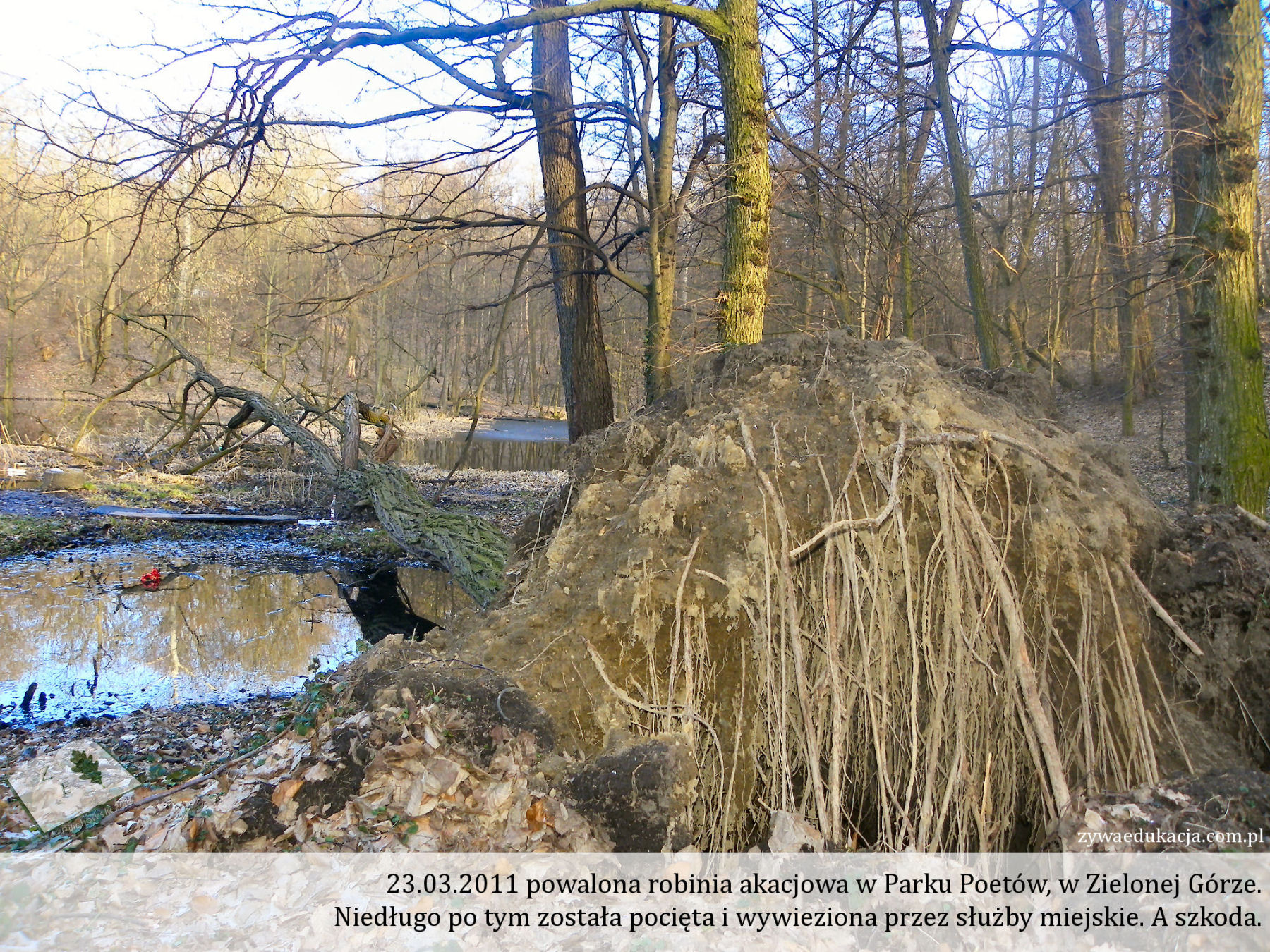 Drzewa również osuszają, skoro pobierają wodę z gleby. Zauważmy, że na wilgotnych stanowiskach rozwijają się przede wszystkim olchy czy wierzby. Mają one duże znaczenie w sukcesji, bo osuszając dane miejsce stwarzają po czasie dogodne miejsce dla innych gatunków drzew. Sukcesją zajmować się tu nie będziemy, ale dość powiedzieć, że nie zawsze zmiany idące w powyższym kierunku są dobre dla np. lokalnie rzadkich gatunków zwierząt i roślin. Niemniej, fakt ten stanowi dowód na to, że w betonowej dżungli, gdzie utwardzona nawierzchnia sprzyja zastojowi wody i dużemu spływowi powierzchniowymi, niosącymi znaczne masy wody, drzewa stanowią ważnego sojusznika człowieka w przeciwdziałaniu nadmiernej retencji wody. Pomyślcie tu np. o piwnicach albo o wczesnej wiośnie po śnieżnej zimie, gdy śnieg topnieje tygodniami. Innymi słowy drzewa odgrywają ważną rolę w regulacji stosunków wodno-glebowych. No tak, ich korzenie również trzymają w ryzach glebę, szczególnie ważne jest to na piaszczystych wałach i nasypach. Na nich wprowadzono przede wszystkim inwazyjną robinię akacjową (grochodrzew biały, tzw. akacja, która akacją nie jest). Ale tu nie będziemy poruszać kwestii roślin inwazyjnych, odwołuję do: [Pilichowski i Kolenda 2016].