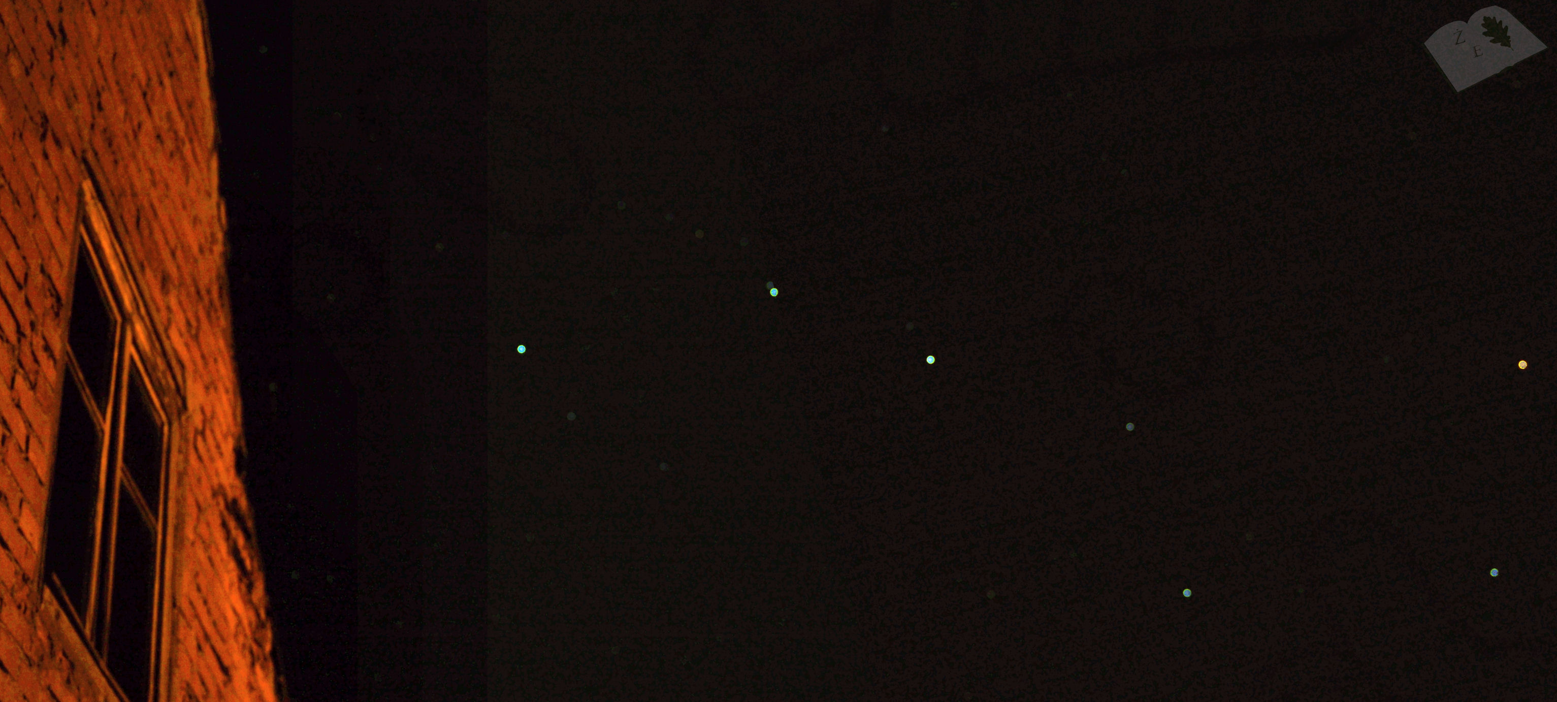 Czyste niebo pod lasem, poza miastem, poza skażeniem światłem sprzyja obserwacji nieba i ciał niebieskich. Wśród nich wyróżnia się właśnie Wielki Wóz, dzięki któremu możemy odnaleźć Gwiazdę Polarną, czyli namierzyć północ. Nie mam lunety, nie mam odpowiedniego sprzętu do zdjęć, ale na poniższym widać niebieskawe punkty - gwiazdy. Z lewej budynek ;) Móóój dom ;)
